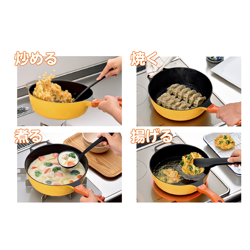 これさえあれば、何でもできる! 平野レミさん考案のレミパン。 焼く、煮る、炊く、蒸す、炒める、揚げる、どんな料理も楽しめます。料理愛好家・平野レミさん考案のマルチフライパン「レミパン」。蓋はスタンド式で置き場所に困りません。 ●サイズ(外寸・約):幅45(持ち手含む)×奥行25×高さ16(蓋含む)cm ●重量(約):1.1kg ●材質:本体=アルミニウム合金(底部=溶射加工、内面=フッ素樹脂塗膜加工、外面=セラミック塗膜加工)/蓋=全面物理強化ガラス/水差し部=ナイロン樹脂/縁部=アルミニウム合金(内面=フッ素樹脂塗膜加工、外面=焼付塗装) ●満水容量(約):3.3L ●IH・ガス火調理器可、食洗機使用不可 ●レシピ本付 ●本体=韓国製/蓋=日本製(ガラス部は中国製)/組立・検査=日本 ※お玉は付属しません。 ※ご使用後の返品・交換はお受けできません。