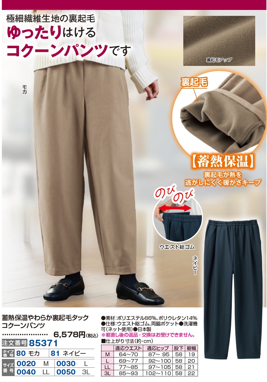 蓄熱保温やわらか裏起毛タックコクーンパンツ