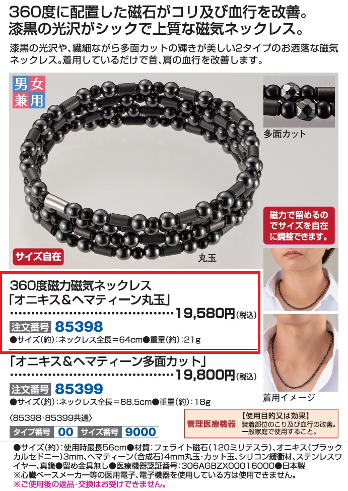 360度磁力磁気ネックレス「オニキス&ヘマティーン丸玉」