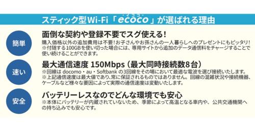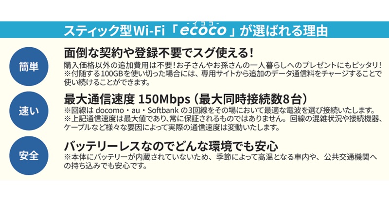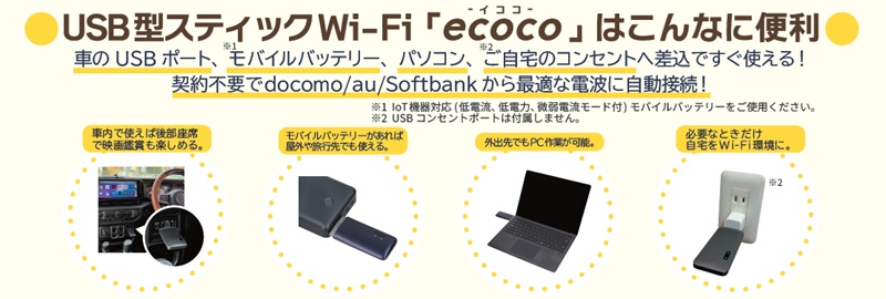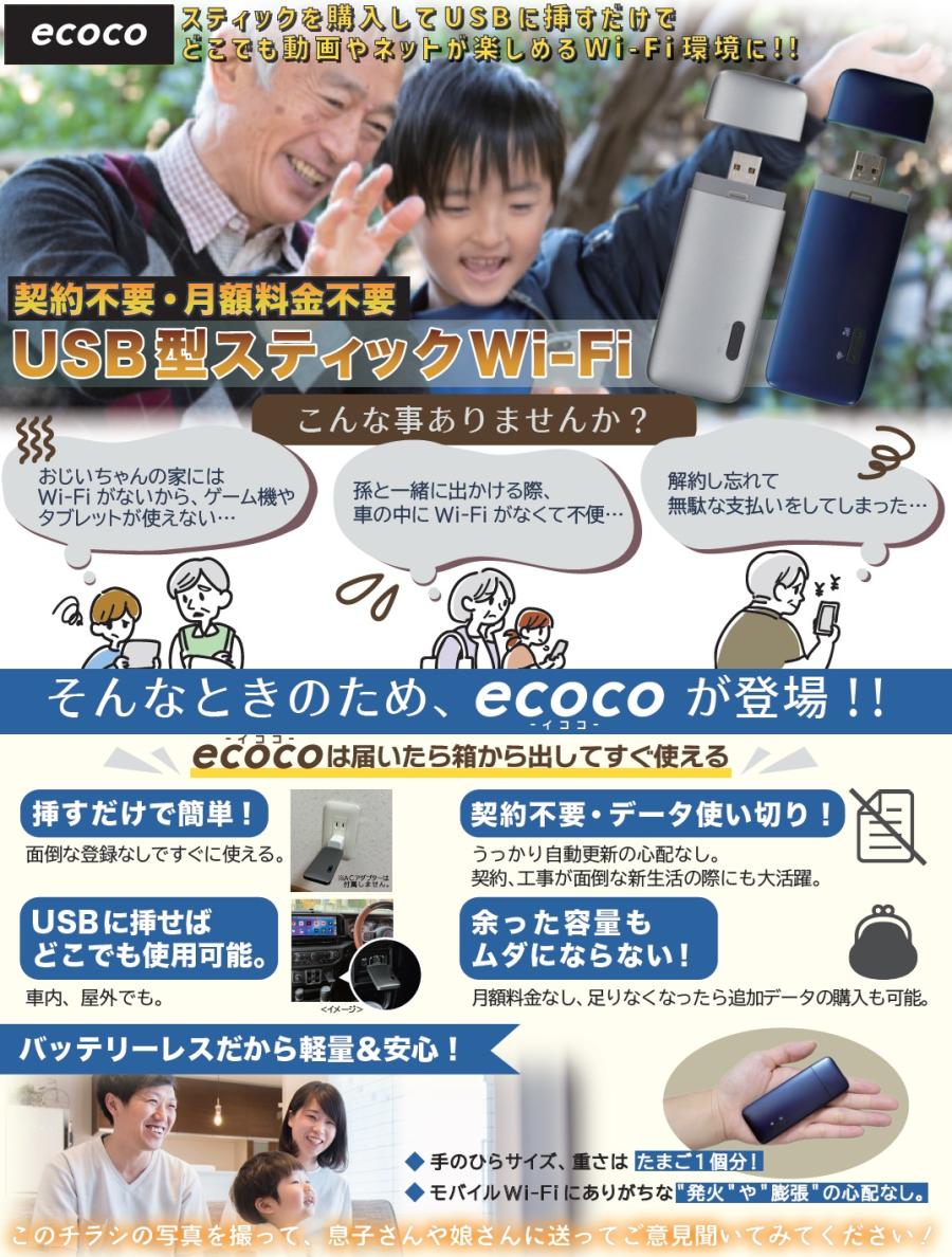 USB型スティックWi-Fi「ecoco」はこんなに便利 車のUSB ポート、モバイルバッテリー、パソコン、ご自宅のコンセントへ差込ですぐ使える! 契約不要でdocomo/au/Softbank から最適な電波に自動接続! ・面倒な契約や登録不要でスグ使える! ・最大通信速度 150Mbps( 最大同時接続数8台) ・バッテリーレスなのでどんな環境でも安心 ●サイズ(約):全長10.2×幅4×厚さ1cm ●重量(約):35g ●材質:外装=ABS 樹脂/基板=エポキシ樹脂、ガラス繊維 ●付属品:USB 変換コード(typeA→typeC) ●中国製 ※ご使用には電源の供給可能なUSB ポートが必要です。 ※本品はスマートフォンやタブレットPC、ノートPC などのデバイスをWi-Fi 接続するためのモバイルWi-Fi ルーターです。ご使用の際には接続するデバイスが必要となります。 ※携帯の電波が圏外となるような場所では使用できません。 ※商品の性格上、開封後の返品・交換はお受けできません。
