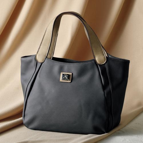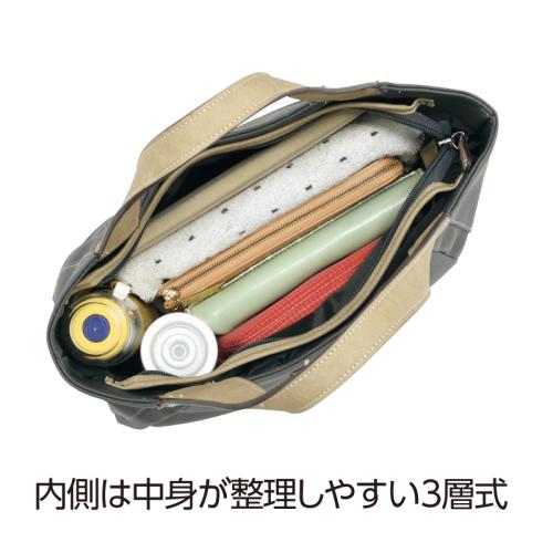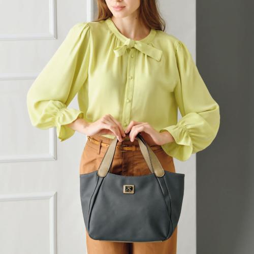 シックな2色使いが魅力。 落ち着いた色合いで、スタイルを選ばずに気軽に使える重宝なバッグです。●カラー:グレー ●サイズ(外寸・約):幅38×高さ22×厚さ13cm/持ち手高さ=15cm ●重量(約):420g ●材質:本体外側=合成皮革/内側=ポリエステル ●仕様:ファスナーメインコンパートメント、両アオリポケット(内部にファスナーポケット×1)/背面=ファスナーポケット×1 ●中国製