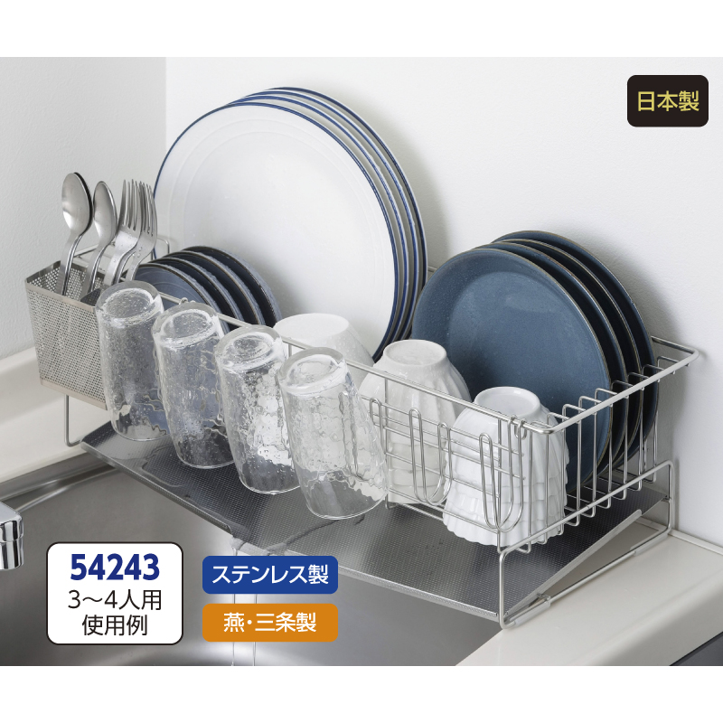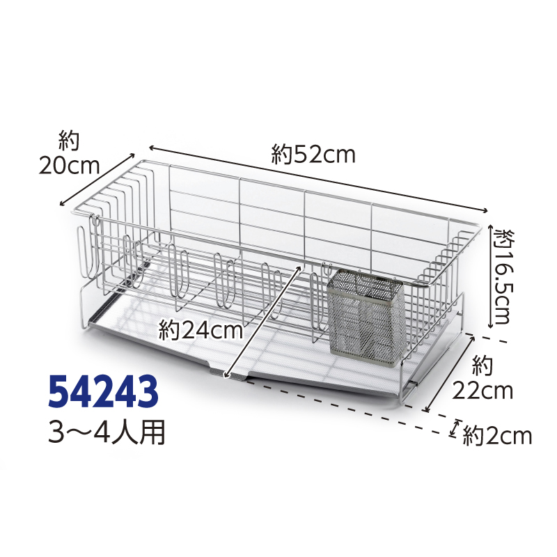 家族の人数で選べる水切りバスケット 収納力に優れ、効率よく水を切ることができるバスケットです。お皿を立てて収納できるワイヤー設計や箸の先が飛び出しにくい箸ポケットなど、使いやすさを追求しました。●サイズ(約):本体(トレー含む)=幅52×奥行24×高さ16.5cm/ワイヤー間=1.7cm/グラスホルダー=幅35.5(ホルダー間5.6cm)×奥行4×高さ8.5cm/箸ポケット=幅9×奥行6.2×高さ10cm ●重量(約):1.42kg ●材質:本体・グラスホルダー・箸ポケット=18-8ステンレス/斜めトレー=18-0ステンレス/脚キャップ=ポリエチレン ●付属品:脚キャップ×4 ●日本製 ※ご使用後の返品・交換はお受けできません。