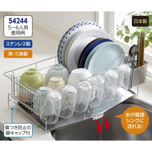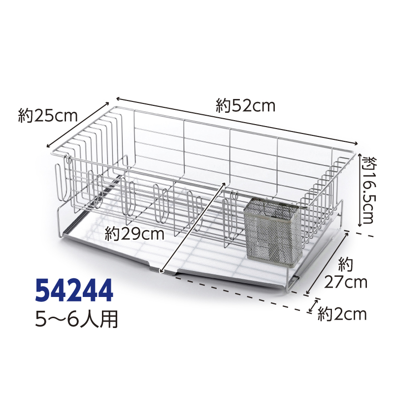 家族の人数で選べる水切りバスケット 収納力に優れ、効率よく水を切ることができるバスケットです。お皿を立てて収納できるワイヤー設計や箸の先が飛び出しにくい箸ポケットなど、使いやすさを追求しました。●サイズ(約):本体(トレー含む)=幅52×奥行29×高さ16.5cm/ワイヤー間=1.7cm/グラスホルダー=幅35.5(ホルダー間5.6cm)×奥行4×高さ8.5cm/箸ポケット=幅9×奥行6.2×高さ10cm ●重量(約):1.61kg ●材質:本体・グラスホルダー・箸ポケット=18-8ステンレス/斜めトレー=18-0ステンレス/脚キャップ=ポリエチレン ●付属品:脚キャップ×4 ●日本製 ※ご使用後の返品・交換はお受けできません。
