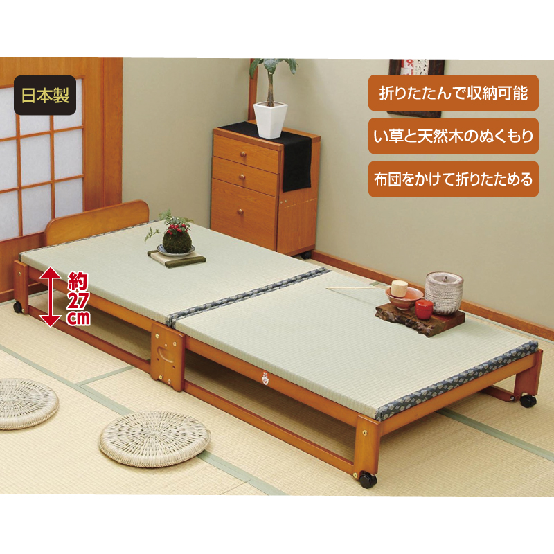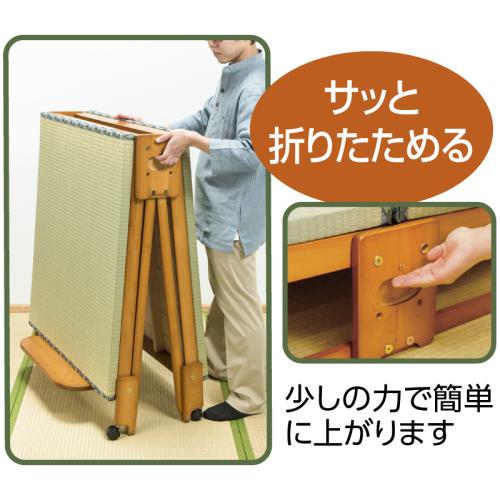 畳とベッドの良いとこ取り。機能も充実。 移動が楽なキャスター付。手触りに配慮した角の丸みや開き防止のストッパーなど機能性にも優れています。 ●サイズ(約):幅94.5×長さ201×高さ39cm(床面までの高さ27cm)/折りたたみ時=幅94.5×奥行38×長さ114cm ●重量(約):24kg ●材質:本体=ラバーウッド材(ウレタン塗装仕上げ)/畳=い草/すのこ=天然木(ひのき) ●耐荷重(約):90kg ●仕様:キャスター×4(取付済) ●一部組立式 ●組立参考時間(約):20分 ●折りたたみ時の開き防止ストッパー付 ●日本製 ※玄関先までのお届けとなります。 ※お届けまで約3週間かかる場合があります。 ※商品の性格上、出荷後のキャンセル及び返品・交換はお受けできません。