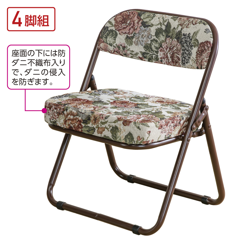 和室にも合う少し低めの椅子。 低めの座面と厚めのクッションで座り心地も快適。収納に便利な折りたたみタイプ。軽量で移動も楽ラク。●サイズ(1脚・約):使用時=幅44×奥行37×高さ52.5cm(座面高さ33cm)/折りたたみ時=幅44×高さ70×厚さ7.5cm ●重量(1脚・約):3.1kg ●耐荷重(1脚・約):80kg ●材質:本体=スチール(ラッカー塗装)/張り地=(表地)ポリエステル、綿、他(裏地)防ダニ加工不織布/中材=ウレタンフォーム ●中国製 ※商品の性格上、一点一点柄の出方が異なります。 ※お届けまで約3週間かかる場合があります。