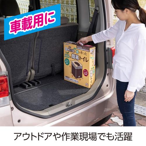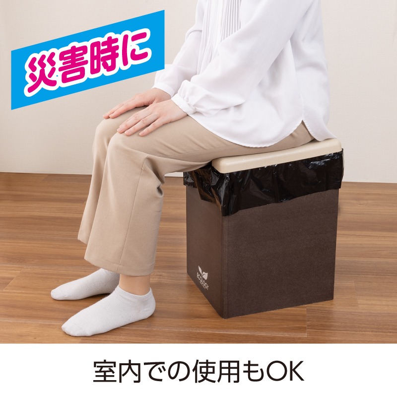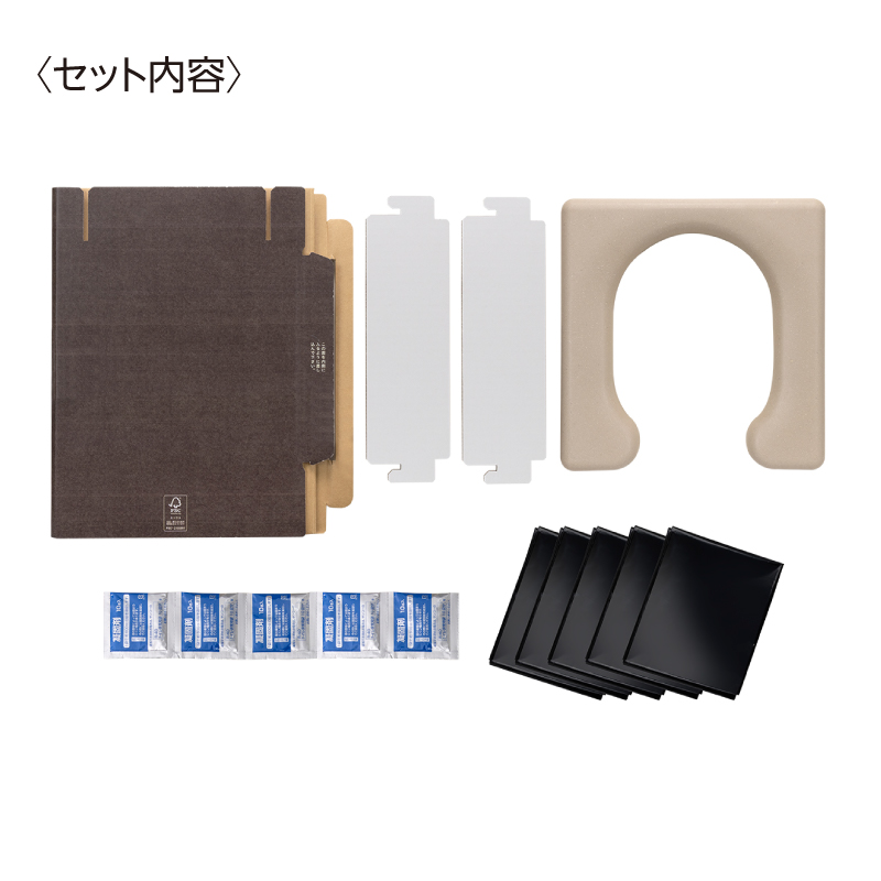 組み立て簡単。いざ!という時に備えて安心。 コンパクトに収納できる組み立て式。耐荷重約120㎏。繰り返して組み立てられます。●サイズ(外寸・約):使用時=幅30×奥行34×高さ41cm/収納時=幅36.5×奥行8.5×高さ40.2cm ●重量(約):871g(組立時) ●耐荷重(約):120kg ●材質:便座=ポリプロピレン(帆立殻配合)/本体・補強パーツ=紙/凝固剤=高分子ポリマー/汚物袋=ポリエチレン ●セット内容:本体、便座、補強パーツ×2、汚物袋×5、凝固剤×5 ●組立式(組立参考時間=約3分) ●日本製 ※廃棄の際は、お住まいの地域のルールに従って処理してください。 ※ご使用後の返品・交換はお受けできません。