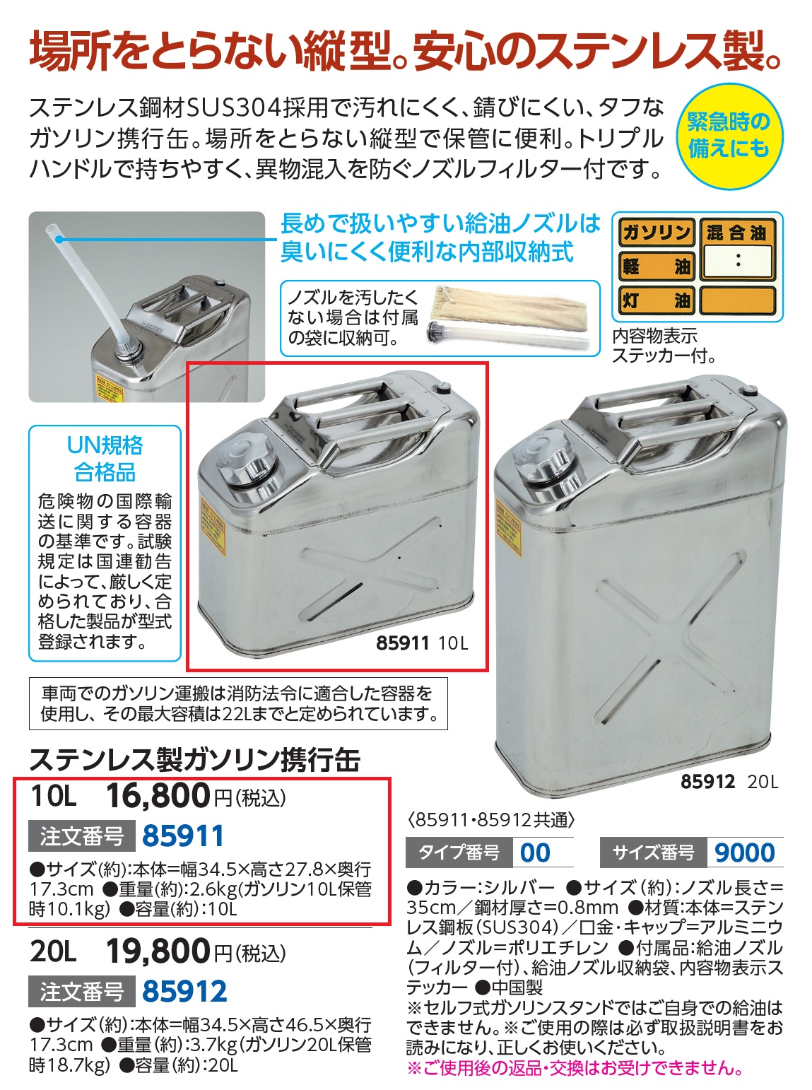 ステンレス製ガソリン携行缶 10L