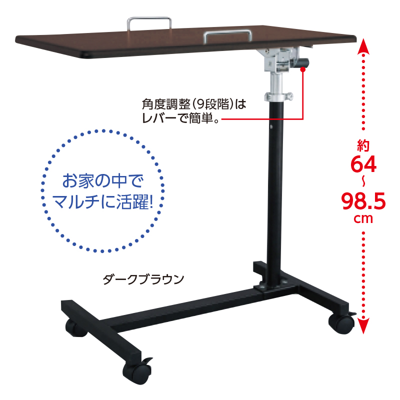 欲しい所にテーブルが出現。移動や角度・高さ調整も簡単。 キャスターで自在に動かせて、角度は9段階、天板の高さは無段階の調整が可能。ベッドでの食事やソファーでの読書、サイドテーブルやパソコン台にと大活躍します。 ●サイズ(約):幅60×奥行34×高さ64~98.5cm ●重量(約):5kg ●耐荷重(天板・約):5kg ●材質:塩化ビニル樹脂化粧繊維板、スチール(クロムメッキ、粉体塗装) ●仕様:高さ無段階調整、天板角度9段階調整、キャスター×4(内2つストッパー付)、天板についている転び止め取り外し可 ●組立式(組立参考時間=約30分) ●台湾製