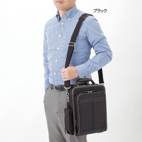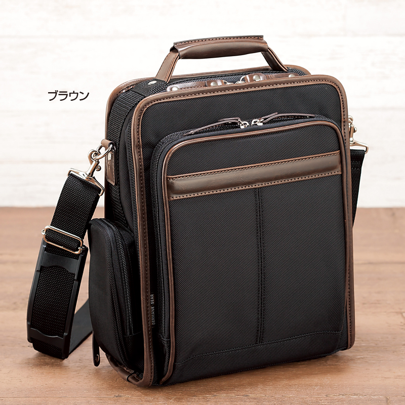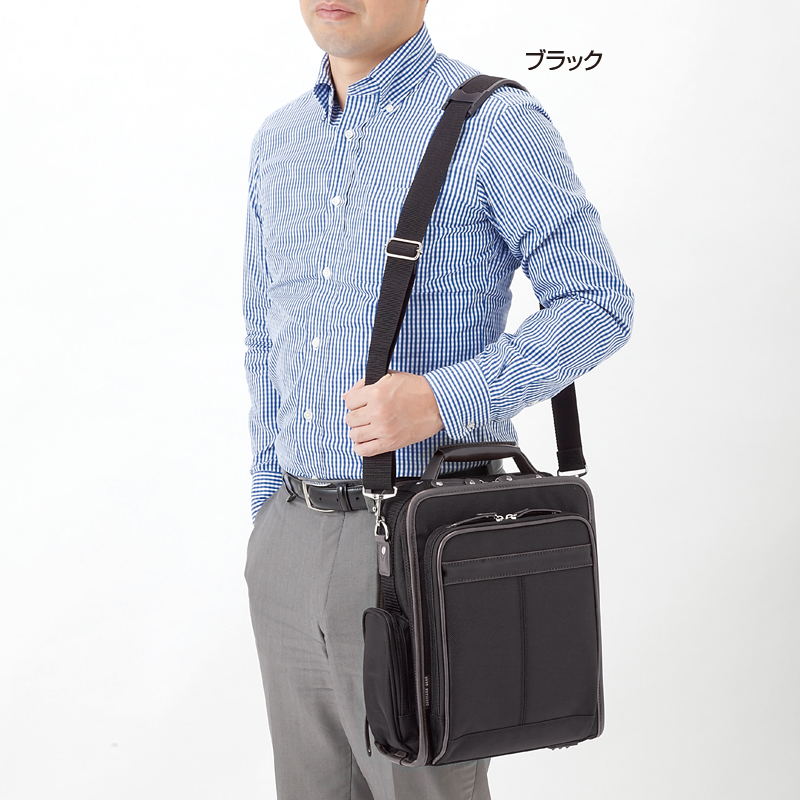 スマートな縦型でも収納力たっぷり。 鞄の街・豊岡の老舗メーカーが企画した機能的なショルダーバッグ。A4サイズも収まる縦型フォルムに2つのコンパートメントがあり、余裕の収納力。床置きもできる、しっかりした作りです。 ●サイズ(外寸・約):幅25×高さ33×厚さ12cm/ショルダーベルト長さ=76~130cm(着脱可)/持ち手高さ=3cm ●重量(約):850g ●材質:表地=ポリエステル、PVC、他/裏地=ポリエステル ●仕様:ファスナーメインコンパートメント(内部にファスナーポケット×1、オープンポケット×1)/前面=ファスナーコンパートメント(内部にオープンポケット×2)/側面=ファスナーポケット×1/背面=オープンポケット×1 ●中国製