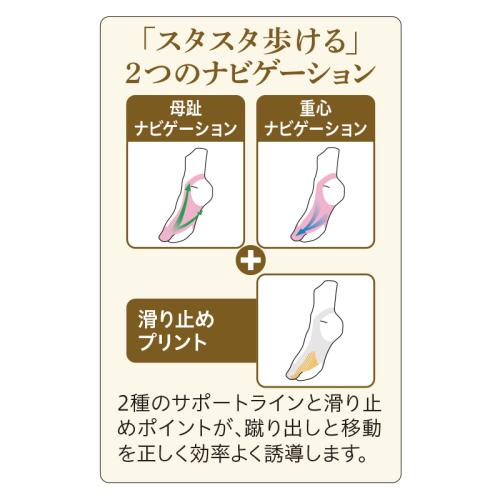 いつもの歩きをスタスタと軽やかに。 踏ん張りやすい足袋型+2つのナビゲーション(特許設計)が、長く速く歩けるスムーズな足運びへ導きます。履き心地もサラリ快適。 ●素材:ポリエステル、ナイロン、他 ●セット内容:ブラック、チャコールグレーの同サイズ2色組 ●洗濯機可 ●日本製 ※ご使用後の返品・交換はお受けできません。