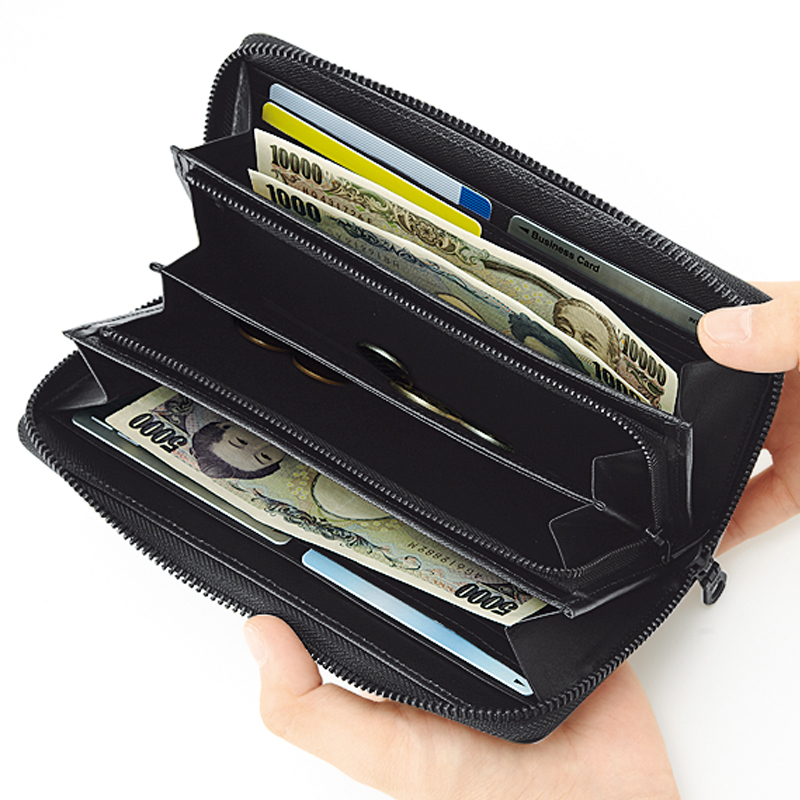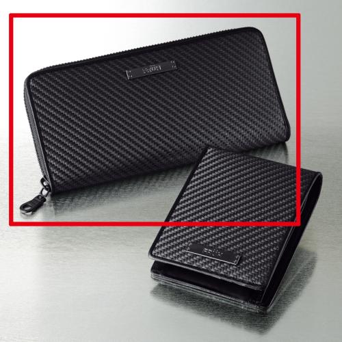 軽さと強さ、精悍な印象羨望のカーボン仕立て。 驚きの軽さと、鉄の約10倍の引っ張り強度を持つといわれているカーボン(炭素繊維)を身にまとった、精悍な漆黒のウォレットです。ファスナーや内部の牛革にもこだわり、丁寧に仕上げました。●サイズ(外寸・約):幅20×高さ9.5×厚さ2.5cm ●重量(約):200g ●材質:表地=カーボンシート(炭素繊維・綾織り)、他/裏地=牛革、レーヨン、他 ●仕様:札入れ×2、カード入れ×24、オープンポケット×2、ファスナー式小銭入れ×1(2層構造、オープンポケット×1) ●ベトナム製 ※商品の性格上、一点一点風合い等が異なります。