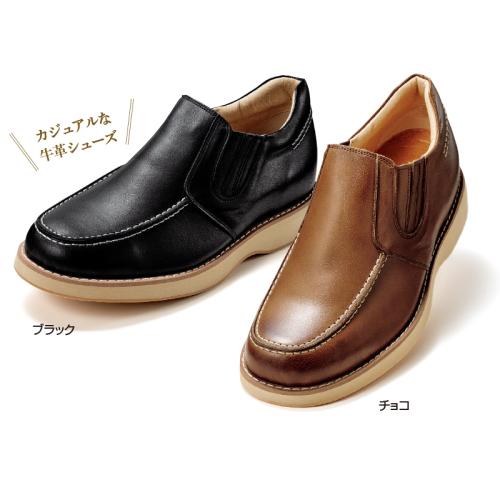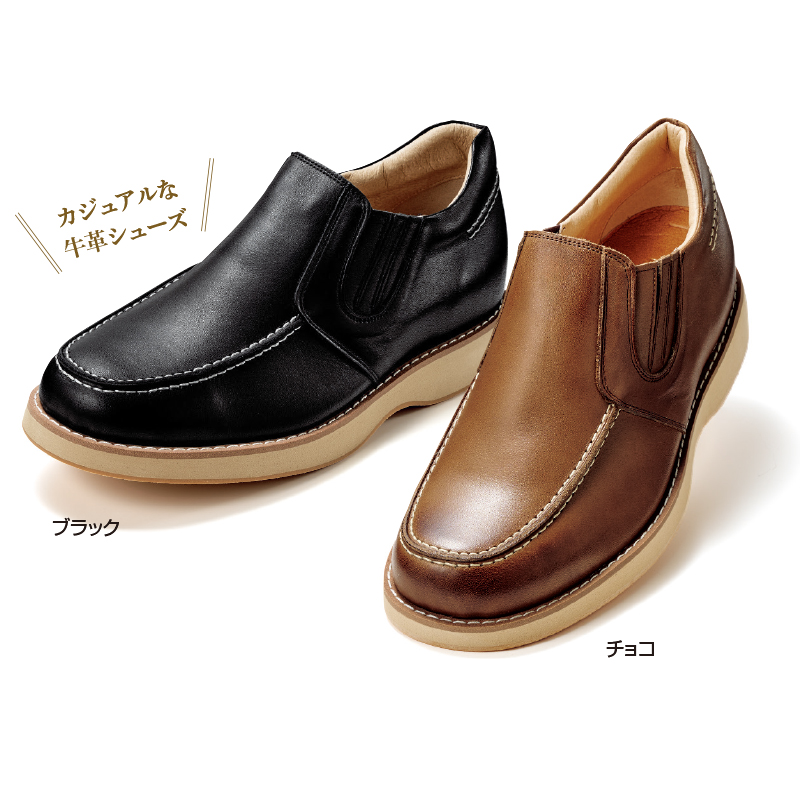 カジュアルシーンでも脚をより長くスマートに。 足もとに気品が漂う、クラシカルな雰囲気のデザイン。インソールに前滑りストッパーを使用し、アップシューズでも疲れにくく仕上げてあります。 ●ヒールアップ高さ(約):5.5cm ●外見ヒール高さ(約):3cm ●ワイズ:4E相当 ●重量(約):410g(25.0cm・片足) ●材質:アッパー=牛革/内側=豚革、ナイロン/ソール=合成クレープ、EVA ●日本製 ※ヒールアップの値は、体重により変化します。