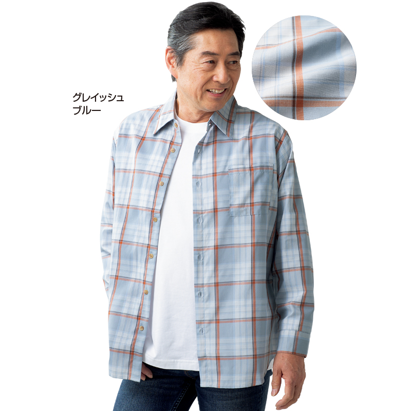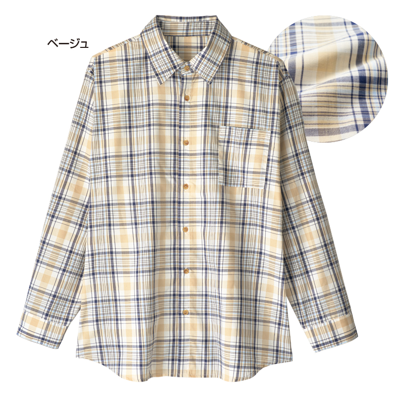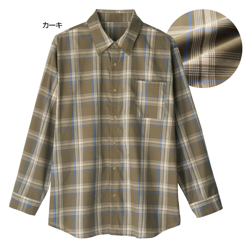大人の上品チェック柄。一枚でも羽織っても。 落ち着いたベーシックなチェック柄はデイリーに使え、ジャケット下でも一枚着でも対応可。サラッとして着やすく、お散歩から遠出まで幅広く着こなせます。 ●素材:ポリエステル65%、綿35% ●仕様:左胸ポケット×1 ●洗濯機可(ネット使用) ●中国製 ※インナーは付属しません。 ※商品の性格上、一点一点柄の出方が異なります。
