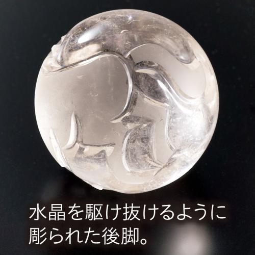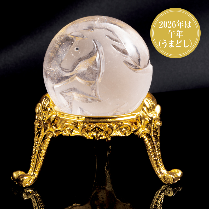 飛躍発展を招くとされる天然水晶と駿馬の縁起物。 直径4cmほどの大きな天然水晶玉に彫り込まれた、駿馬の躍動的な姿。古来より「浄化・活性化」など、様々な効果があると言われている水晶に、伝統工芸士の米長宏之氏が精魂込めて製作しました。駿馬の目にはブラックダイヤがあしらわれています。 ●サイズ(約):水晶玉=直径4cm/台座=幅(最大)6.5×高さ3.3cm ●重量(約):水晶玉=100g/台座=38g ●材質:天然水晶、ブラックダイヤ(1石、約0.01ct)/台座=亜鉛合金 ●日本製(水晶=ブラジル産) ※天然石のため、一点一点サイズ・重量・風合いが異なります。 ※水晶玉には天然水晶特有のクラック・内包物が入ります。 ※お届けまで約3週間かかる場合があります。