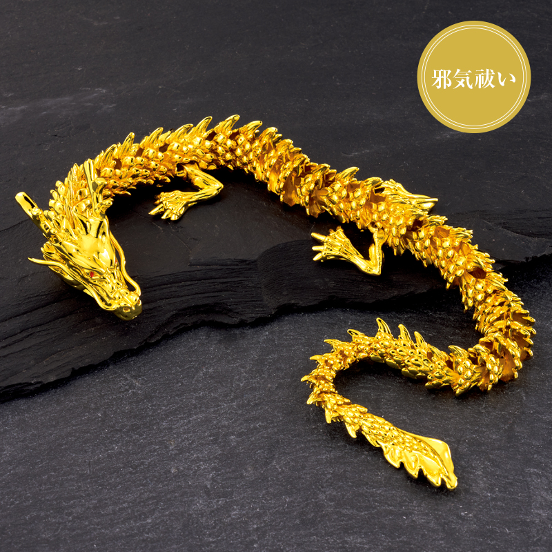 40個のパーツで自在に動く金龍を迫力ある厄除けオブジェに。 邪気を祓い、機運を招くといわれる金龍の姿を再現。40個のパーツで組み立てられており、平置きしたり、モノに絡ませたり、お好きなポーズが楽しめます。 ●サイズ(約):幅(最大)4.8×全長34cm ●重量(約):205g ●材質:真鍮合金 ●中国製