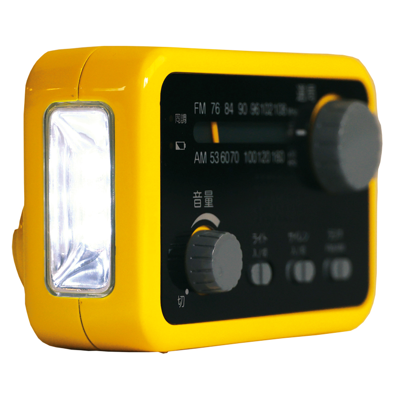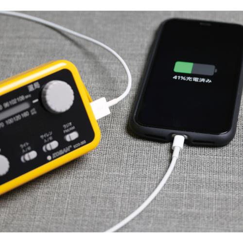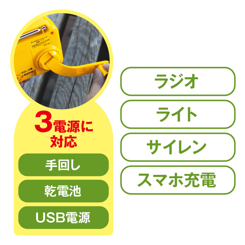 手回しでも聴ける長期備蓄ラジオ。 バッテリー劣化の心配がなく、防災袋に入れたまま長期保管が可能。3つの電源でスマートフォンの充電もでき、防塵・防水仕様でアウトドアにも便利です。 ●カラー:イエロー ●サイズ(約):幅10.7×奥行5×高さ6.9cm ●重量(約):208g ●材質:ABS樹脂 ●電源:内蔵蓄電器(キャパシタ3V20F)または単3形アルカリ乾電池×2(別) ●連続使用時間(乾電池使用時・約):ラジオ=AM160時間・FM120時間(JEITA規格/ライト点灯時間=65時間/サイレン=35時間) ●出力(乾電池使用時):4~5.5V、300~600mA ●外部電源入力端子:USBmicroB ●出力端子:USB-A×1・イヤホン端子×1 ●ラジオ受信周波数:AM=530~1600KHz/FM=76~108MHz(ワイドFM対応) ●内蔵スピーカー:直径32mm ●スピーカー音声出力:60mW(最大100mW) ●仕様:LEDライト×3、サイレン(出力音量=75dB)、防塵・防水性能IP54相当 ●付属品:USBケーブル(TypeA、micro)、microUSB to USBTypeC変換プラグ、USBTypeC to USBTypeA変換アダプター、ストラップ ●中国製 ※一部適合しない携帯電話・スマートフォンがあります。お持ちの充電ケーブルをご使用ください。 ※ご使用後の返品・交換はお受けできません。