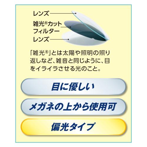 そのままでもメガネの上にも。ワンランク上のクリアな視界を実現。 ワンランク上の偏光レンズ「タレックス」が雑光や紫外線をカット。まぶしさを防ぐだけでなく、目に有害な光だけを取り除きます。プラスチック特有のひずみも抑え、視界はスッキリ。目の疲労も軽減します。 ●サイズ(約):幅15.4×高さ4.7×つるの長さ12.6cm/適応メガネサイズ=幅13.3×高さ4cm以内 ●重量(約):30g ●材質:レンズ=プラスチック(ハードマルチシングルコート)/フレーム=ナイロン ●可視光線透過率(約):30% ●紫外線透過率:1.0%未満 ●偏光度:99%以上 ●付属品:セミハードケース、レンズクロス ●日本製 ※夜間及びトンネル内では使用しないでください。