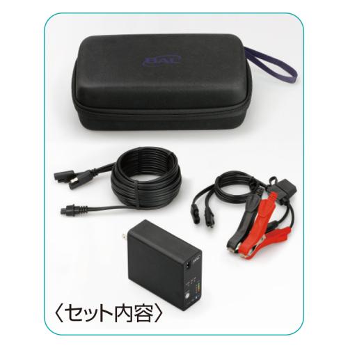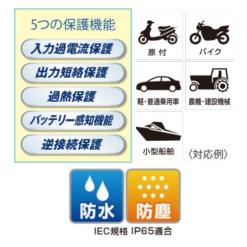 原付・オートバイ・乗用車に。スマホや本体でかんたんに操作できる手のひらサイズの充電器。 つなぐだけで簡単に充電可能。各バッテリーに対応した専用モードを搭載しており、スマートフォン(専用アプリ)を使えば充電のオン・オフや充電状況の確認・バッテリータイプの選択など手元で操作できます。専用収納ケース付で持ち運びに便利です。 ●サイズ(約):幅3.2×奥行8.3×高さ7.2cm ●重量(約):400g ●材質:ポリカーボネート ●入力電圧:AC100V ●出力電圧(ディープサイクル・最大):DC15.3V ●出力電流:0.8A(0.75±10%)・3A(±10%)・6A(±10%) ●消費電力:最大100W以下 ●適合バッテリー容量:15Ah~100Ah(5時間率)/2Ah~100Ah(10時間率) ●対応バッテリータイプ:STD、AMG、ISS、DEEP、LI(DC12.8V Life04) ●仕様:防水・防塵設計(IEC規格IP65適合) ●セット内容:本体、充電ターミナルコード(約3.8m)、充電クリップコード、専用収納ブローケース ●中国製 ※ご使用後の返品・交換はお受けできません。