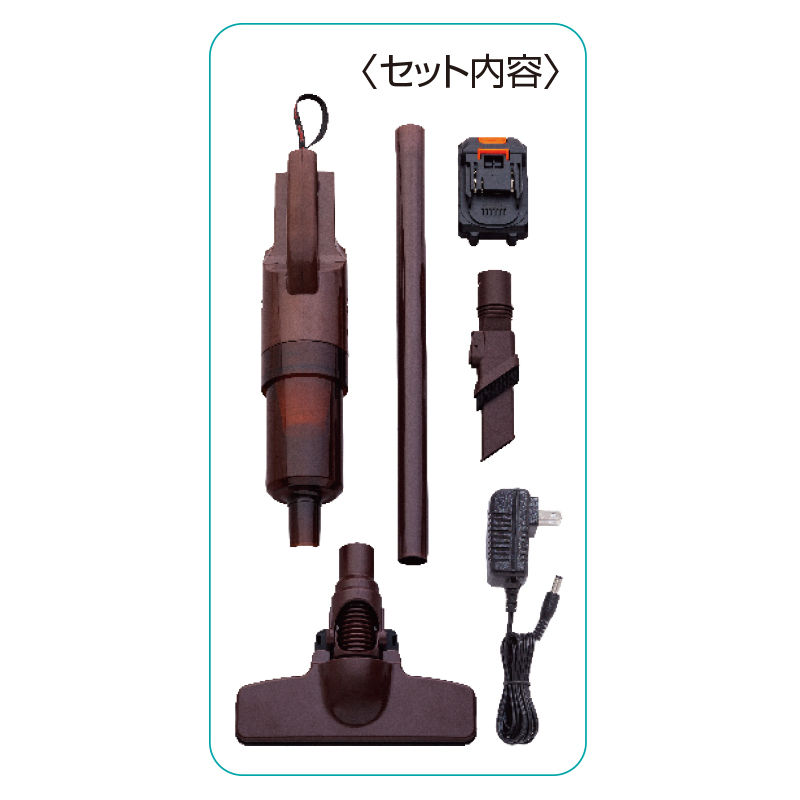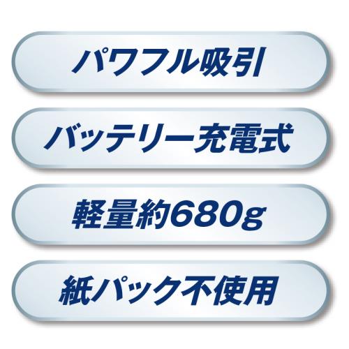 これ1台で車も家もラクラク掃除。コードレスなのにパワフル吸引! 500円玉もスッと吸い込む強力な吸引力。壁際や角、家具の隅にもスムーズに対応。軽いので持ち運びもラクラク。すぐ使えるので、ちょっとしたお掃除も苦になりません。●サイズ(本体・約):幅9×奥行11.5×高さ42・101(ブラシ・パイプ取付時)cm ●重量(約):680g(ブラシ・パイプ・バッテリー除く) ●材質:ABS樹脂、他 ●電源:リチウムイオン充電池 ●充電時間(約):3時間 ●連続使用時間(約):18~19分 ●バッテリー:容量=1500mAh/電圧=21V/吸い込み仕事率=約88W ●集塵容量(約):500ml ●稼働音量:74dB ●6点セット内容:本体、ノズル、2WAY隙間用ノズル、ストレートパイプ、バッテリー、ACアダプター(コード長さ=1.8m) ●中国製 ※ご使用後の返品・交換はお受けできません。