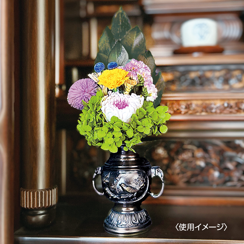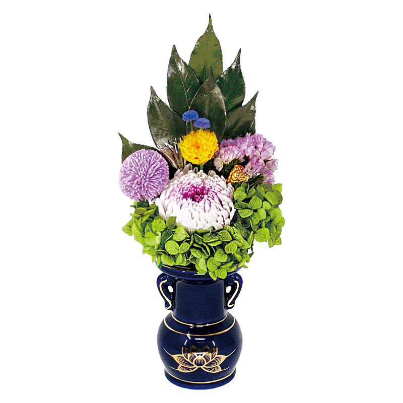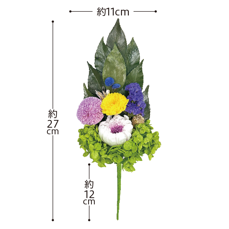 水やりも交換も不要。美しさが長続きします。 プリザーブドフラワーを使用しているので、枯れることなく、鮮やかさをキープ。落ち着いたたたずまいは、どんなお仏壇にもしっくりと馴染みます。 ●サイズ(約):幅11×奥行8×全長27cm/茎の長さ12cm ●重量(約):40g ●材質:天然素材(プリザーブド加工)=椿葉、輪菊、小菊、アジサイ ●日本製 ※天然素材かつ手作り品のため、色や形、大きさが多少異なる場合があります。 ※花材の一部が変更になる場合があります。