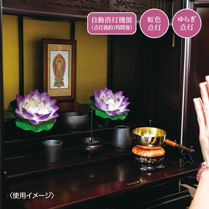 穏やかな光で故人を偲ぶ、ゆらぎ、ほんのり灯る仏花。 古来より神聖な花とされる蓮にLEDライトを組み込んだ「光る仏花」。コンパクトサイズなので限られたスペースにも設置しやすく、「虹色点灯」「ゆらぎ点灯」「電源オフ」から選べます。 ●カラー:パープル ●サイズ(1個・約):直径11×高さ7cm ●重量(1個・約):60g ●材質:ポリエステル、ABS樹脂 ●電源:単3形乾電池×3(別・1個につき) ●仕様:点灯モード切替(虹色点灯、ゆらぎ点灯)、自動消灯機能(点灯後約1時間後) ●中国製