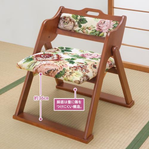 正座がつらい方も楽々。収納簡単な天然木椅子。 高級感のある天然木に金糸を使用した花柄クッションが優美な、立ち座りしやすい高さの椅子。座面と背部のクッションは、程よい弾力でやさしい座り心地。折りたためば省スペースで収納できます。 ●カラー:座面・背もたれ=ホワイト×ピンク系(花柄) ●サイズ(約):使用時=幅50×奥行51×高さ60cm/座面高さ=36cm/収納時=幅50×奥行19×高さ73cm ●重量(約):6.5kg ●耐荷重(約):80kg ●材質:本体=天然木(ラバーウッド・ラッカー塗装)/張地=ポリエステル/中材=ウレタンフォーム ●ベトナム製 ※商品の性格上、一点一点柄の出方が異なります。 ※お届けまで約3週間かかる場合があります。