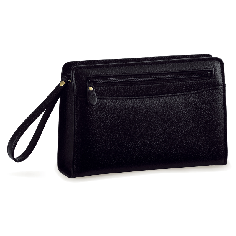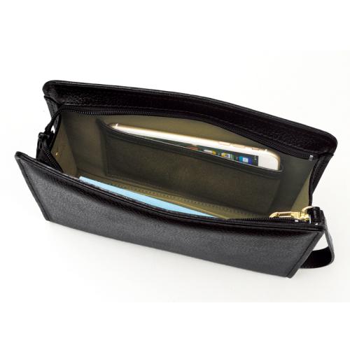 フォーマルな席で手にしたい黒革の美しいバッグ。 豊岡の職人が丹精込めて作り上げた牛革セカンドバッグ。紳士の装いに高級感と格調を生み出します。 ●カラー:ブラック ●サイズ(外寸・約):幅25×高さ17×厚さ7cm/ストラップ長さ=18cm(着脱可) ●重量(約):340g ●材質:表地=牛革/裏地=綿 ●仕様:ファスナーメインコンパートメント(内部にオープンポケット×1、スマホ用ポケット×1)/前面=ファスナーポケット×1 ●日本製