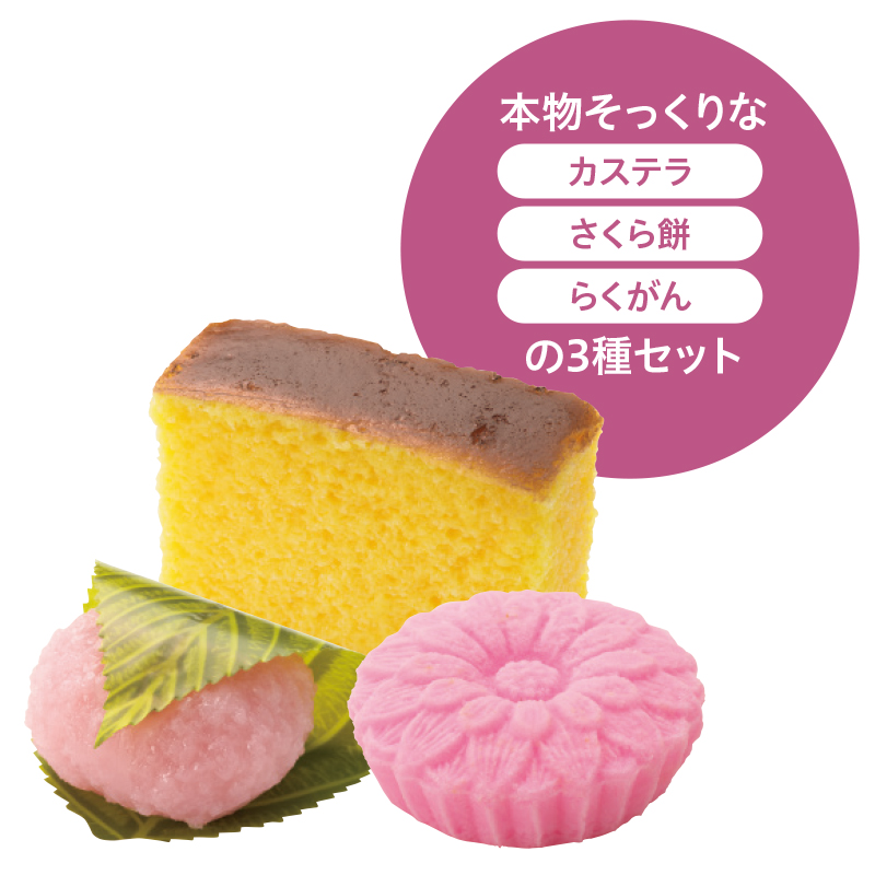 いつまでも美味しそう。本物そっくりなお供え菓子。 取り替える手間や腐る心配のいらない、本物そっくりの3種類のお供え菓子。いつまでもお供えしたてのような美しさをキープします。精巧な作りなため、間違っても口に入れないようご注意ください! ●セット内容:①さくら餅、②らくがん、③カステラ ●サイズ(約):①=幅4.6×奥行6.5×高さ3.2cm/②=直径6.3×高さ2cm/③=幅7×奥行2.6×高さ6cm ●重量(約):①=48g/②=45g/③=120g ●材質:PVC ●日本製 ※お盆は付属しません。 ※商品の性格上、一点一点風合いが異なる場合があります。