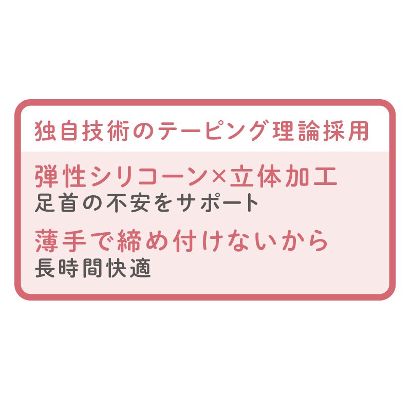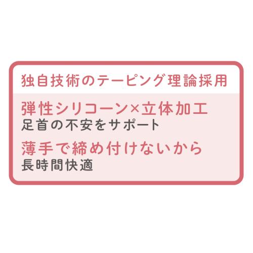 人工筋肉で足首が安定!自然な一歩をサポートします。 シリコーン加工されたサポーターが固定と動きやすさを両立させ、足首を支え、歩行を安定させます。 ●カラー:ブラック ●サイズ(約):適応足サイズ=22~27cm ●材質:ポリエステル、ナイロン、ポリウレタン、シリコーン(タフシロン) ●手洗い可 ●日本製 ※ご使用後の返品・交換はお受けできません。