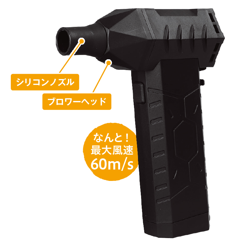 充電式の小型ブロワーなのに噴射力がスゴイ!! 大風量プロペラファン&強力ブラシレスモーター採用で、最大風速がメーカー従来品の約1.3倍に。最大風速60m/秒の小型&軽量な充電式ブロワーです。お仕事からプライベートまで大活躍。 ●サイズ(約):幅4.2×奥行8.1×高さ13.8cm ●重量(約):275g ●材質:ABS樹脂 ●電源:リチウムイオン充電池(7.4V/2500mAh) ●充電時間(約):120分 ●連続使用時間(フル充電時・約):ブースト=10分/強=30分/中=60分/弱=120分 ●風速:ブースト=60m/秒/強=43m/秒/中=35m/秒/弱=25m/秒 ●最大稼働音量:90dB ●付属品:ブロワーヘッド、シリコンノズル、ストラップ、USBType-Cケーブル(約50cm) ●中国製 ※ご使用後の返品・交換はお受けできません。