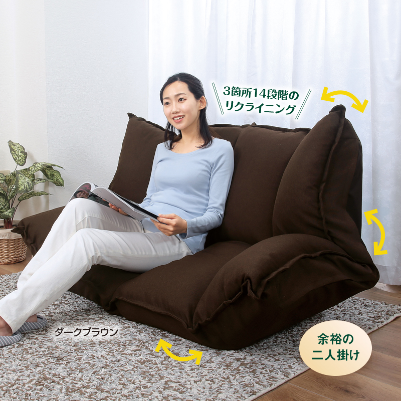 お好みの姿勢で心ゆくまでリラックス。 背もたれとその両端、肘掛けがそれぞれ14段階にリクライニング。読書、お昼寝からテレビ観賞まで、自分に合った快適なスタイルでくつろげます。 ●サイズ(約):幅116~160×奥行75~115×高さ18~60cm/座面高さ=18cm ●重量(約):17.4kg ●耐荷重(約):80kg ●材質:構造部=スチール/中材=ウレタンフォーム、ウレタンチップ/張地=ポリエステル ●仕様:背もたれ・ヘッド両端・肘掛け=リクライニング各14段階 ●中国製 ※お届けまで約2週間かかる場合があります。