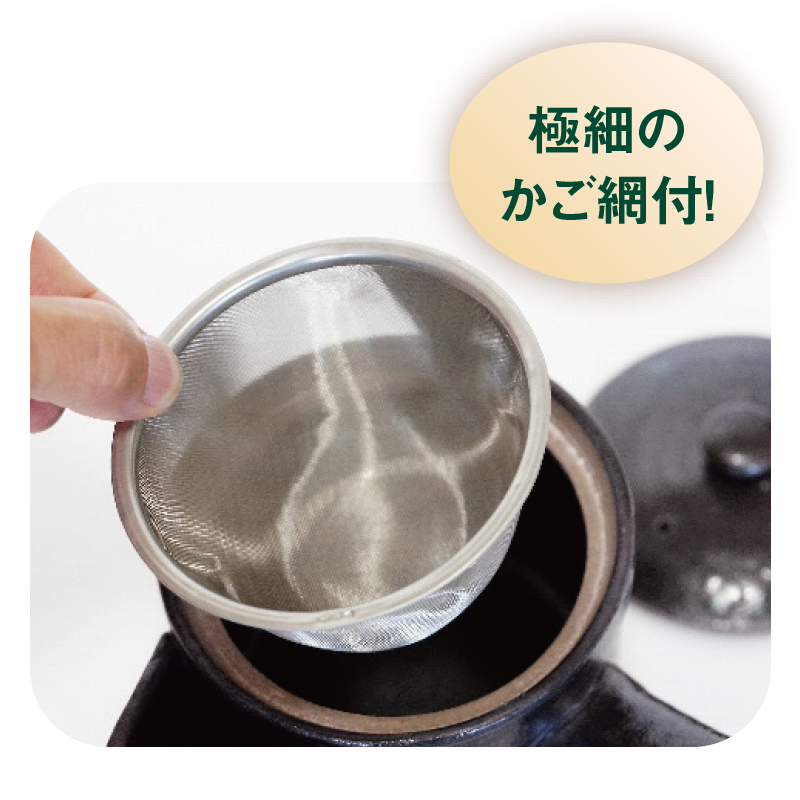 急須でコーヒーを淹れてちょっと一息。 陶器の特性により、雑味がとれた美味しいコーヒーを急須で簡単に楽しめます。極細かご網は目詰まりしにくく、使用後のお手入れもラクラク。 ●カラー:ブラック ●サイズ(約):幅17.5(持ち手含む)×奥行10.5×高さ(ふた含む)10cm/メッシュフィルター=直径9×高さ5.5cm ●重量(約):400g ●容量(約):最大300ml ●材質:本体=陶器/メッシュフィルター=ステンレス(SUS304) ●日本製 ※ご使用後の返品・交換はお受けできません。