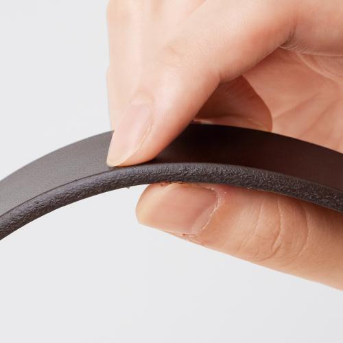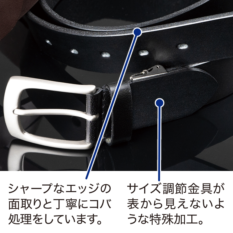 肉厚な栃木レザーの一枚革。重厚感をオンオフに。 熟練のベルト職人が栃木レザーを使って丹念に仕上げました。1カ月半もの時間をかけて植物タンニンで入念になめし、十分な油脂を与えた革は、約4mm厚ながら驚くほどしなやか。使い込むほどに味わい深い艶が出ます。 ●サイズ(約):全長115×幅3.3×厚さ0.4cm/適応ウエスト=最大100cm ●重量(約):170g ●材質:牛革(栃木レザーサマーオイル仕上げ)/バックル=真鍮、ニッケルメッキ(艶消し) ●仕様:ベルト穴5穴(2.5cmピッチ) ●日本製 ※ベルトカット後の返品・交換はお受けできません。