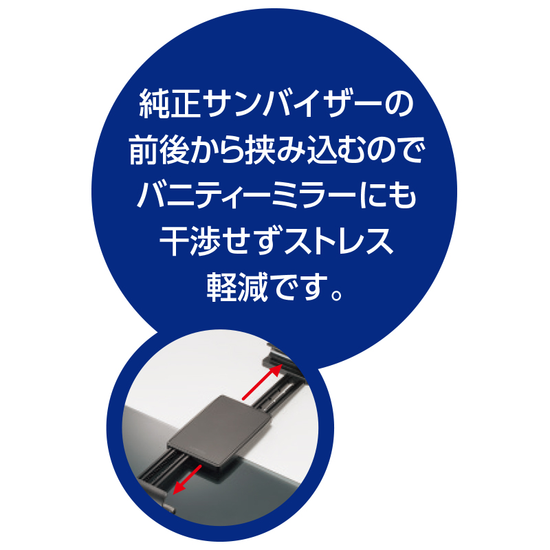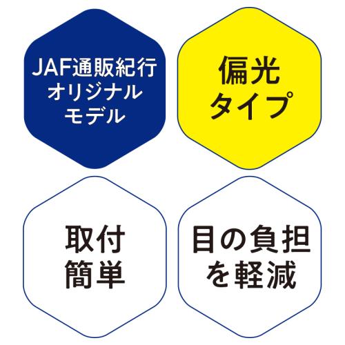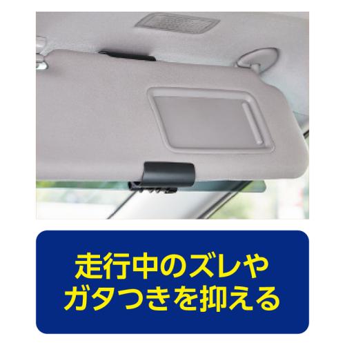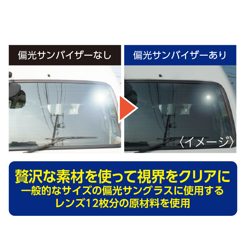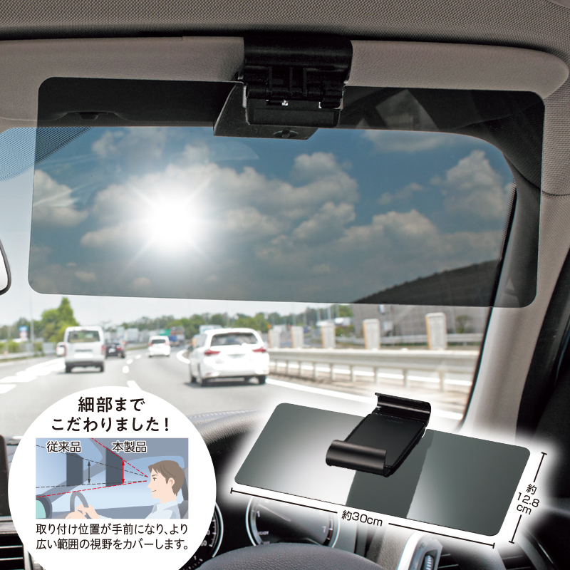 眩しい光をカットするサンバイザーで視界も確保しながら運転をサポート ●サイズ(収納時外寸・約):幅30×高さ(取付部含む)14.7×厚さ4.6cm ●重量(約):164g ●材質:ポリカーボネート、POM樹脂、他 ●可視光線透過率(約):18% ●紫外線透過率:1%以下 ●偏光度:97%以上 ●日本製 ※純正サンバイザーの厚さが2.4cm以内・奥行14.8~29.2cmまでの車に適合します。 ※偏光サングラスとの併用はお避けください。 ※夜間及びトンネル内では使用しないでください。
