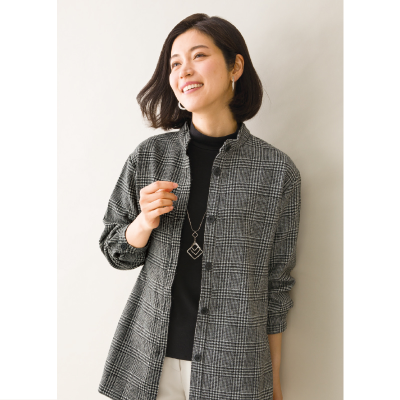 普段使いにもお出かけにも。シックな表情をゆったりシルエットで。 古くから織物の産地として有名な尾州織のウール混生地を使用した、味わい深い上質な風合い。クラシカルなグレンチェック柄を生かした、スタンドカラーのベーシックなブラウスジャケットです。羽織ったり前を閉じたり、着こなしも自在。 ●カラー:ブラック系 ●素材:毛60%、ポリエステル30%、ナイロン5%、アクリル3%、レーヨン2% ●仕様:前ボタン全開(6個)、袖ボタン(各1個)、両脇スリット(約12cm) ●手洗い可 ●日本製 ※インナー、アクセサリーは付属しません。 ※商品の性格上、一点一点柄の出方が異なります。