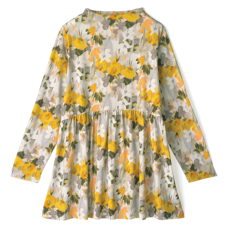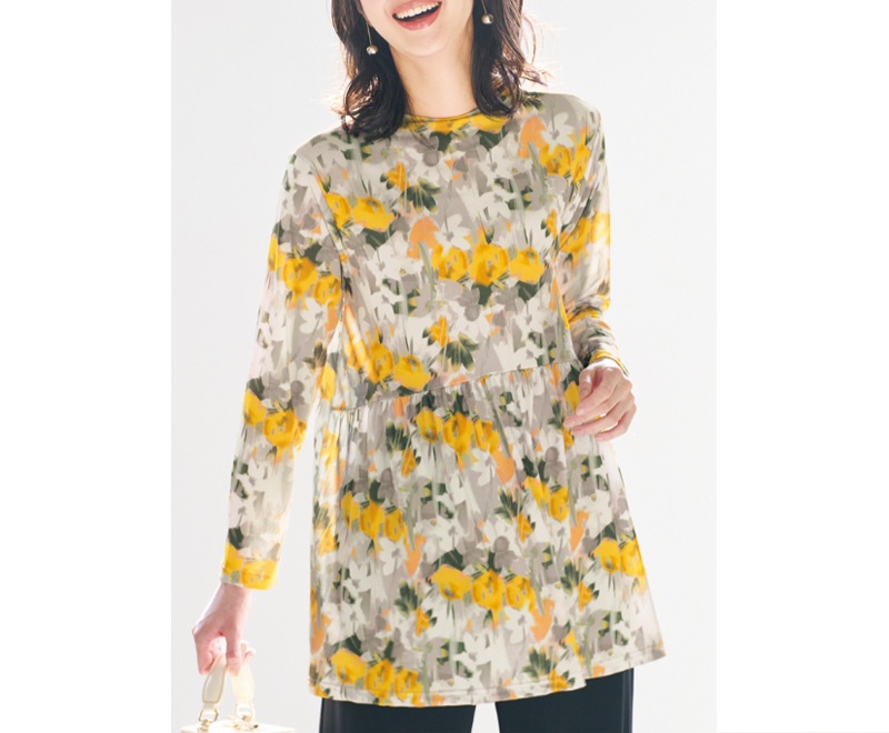 春をまとったように華やかな主役チュニック。 着やすいカットソーに、ぼかし風色彩の美しい花柄をプリントしました。ウエスト部分のギャザーで気になるお腹まわりもふんわりカバー。腰まですっぽり隠れるロング丈です。 ●カラー:イエロー系 ●素材:ポリエステル95%、ポリウレタン5% ●手洗い可 ●韓国製 ※アクセサリーは付属しません。 ※商品の性格上、一点一点柄の出方が異なります。
