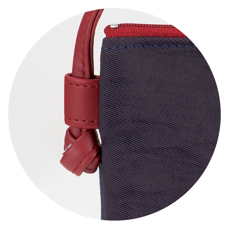 肩ひもは先端で結び直して短くできます。裏面はナイロン生地なので色移りしない仕様です。