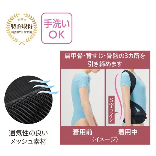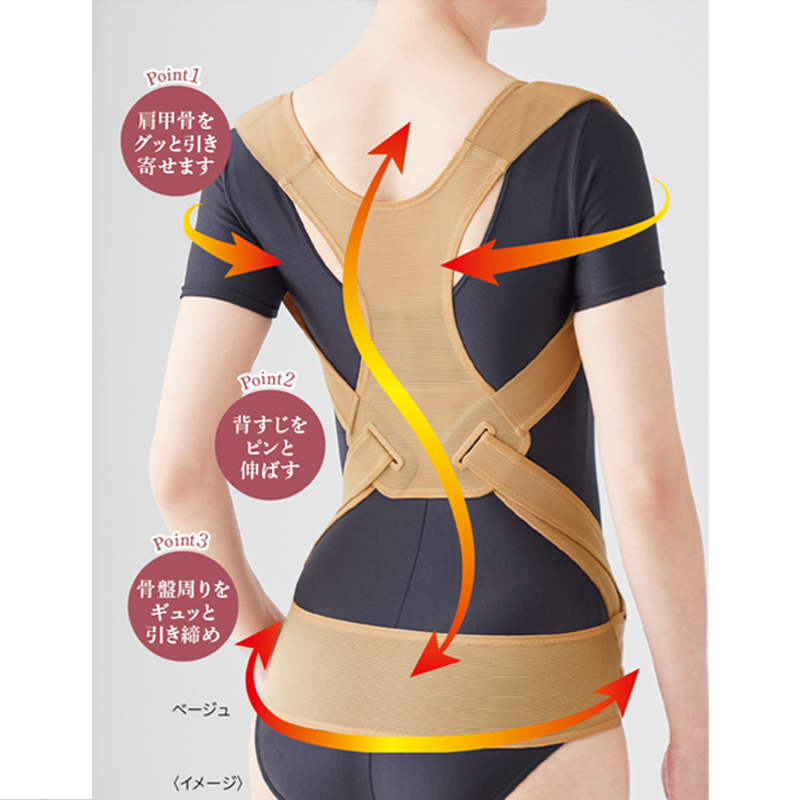 肩甲骨や骨盤から姿勢を整えて若々しく。 骨盤もサポートして、丸まった背中を起こす「姿勢のサポーター」。3つのポイントで理想的なS字ラインへ導きます。 ●素材:ナイロン、ポリウレタン、他 ●手洗い可 ●日本製 ※ご使用後の返品・交換はお受けできません。