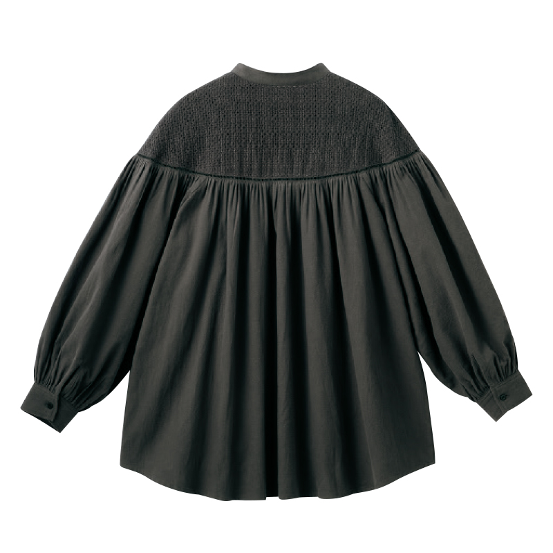 ゆったり綿ブラウスを繊細なディテールで優美に。 たっぷりギャザーをシックな色と比翼仕立てですっきりとした印象に仕上げました。前後のヨークに配した刺しゅうとはしごレースが上品なアクセント。 ●カラー:チャコールグレー ●素材:本体・刺しゅう糸=綿100% ●仕様:前ボタン全開(1個・比翼ボタン6個)、袖口ボタン(各1個) ●手洗い可 ●中国製 ※アクセサリーは付属しません。