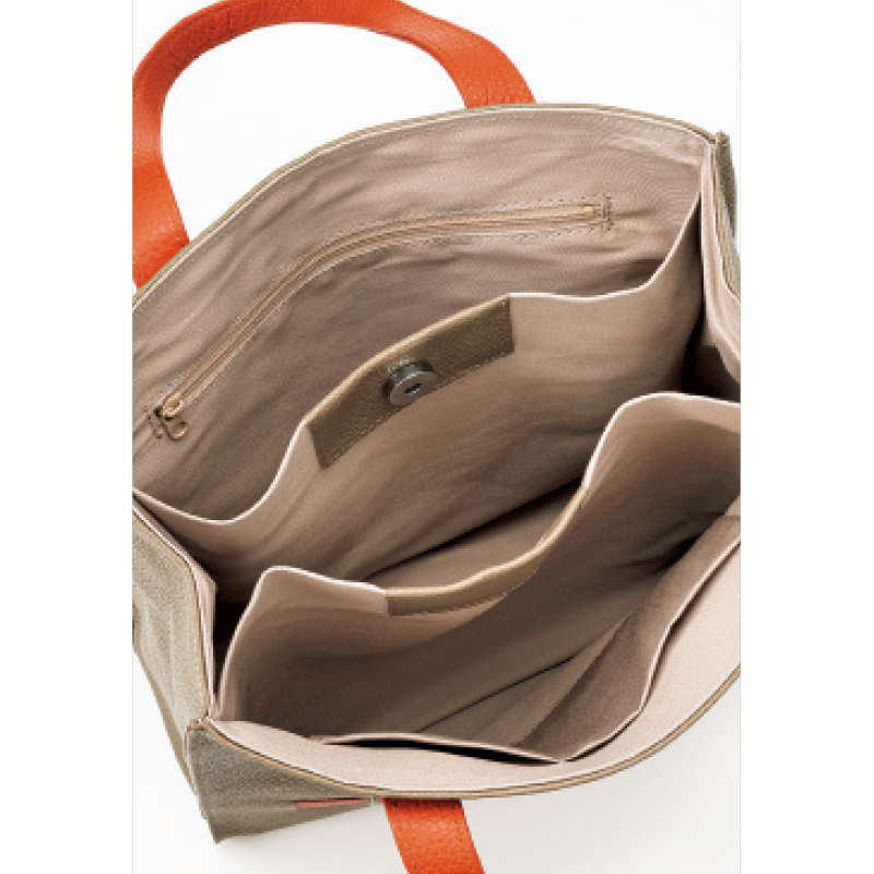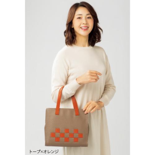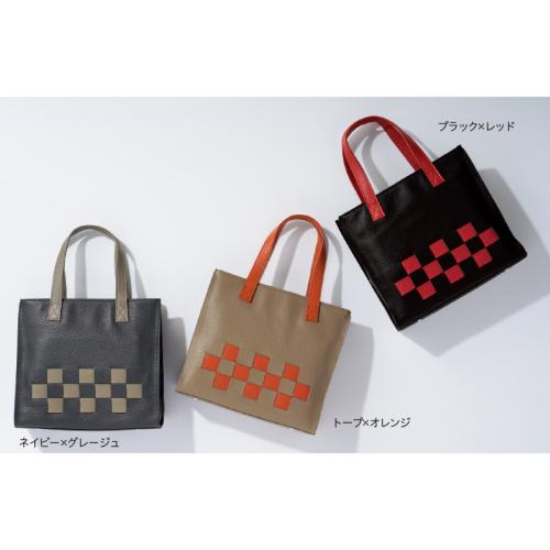 イタリアンレザーの質感と発色の良さを活かしたモダンな格子柄バッグ。 上質レザーが映えるスクエア型のフォルムに格子柄と持ち手の配色がアクセント。ちょっとしたお出かけやお買い物はもちろん、お稽古ごとのバッグにも重宝するちょうどよいサイズです。 ●サイズ(外寸・約):幅27.5×高さ24.5×厚さ10cm/持ち手高さ=15cm ●重量(約):480g ●材質:表地=牛革/裏地=綿 ●仕様:オープンメインコンパートメント(内部に仕切り兼用マグネットホック付オープンポケット×1)/前後あおりポケット(内部にファスナーポケット×1、オープンポケット×2)/背面=ファスナーポケット×1/底鋲×4 ●日本製