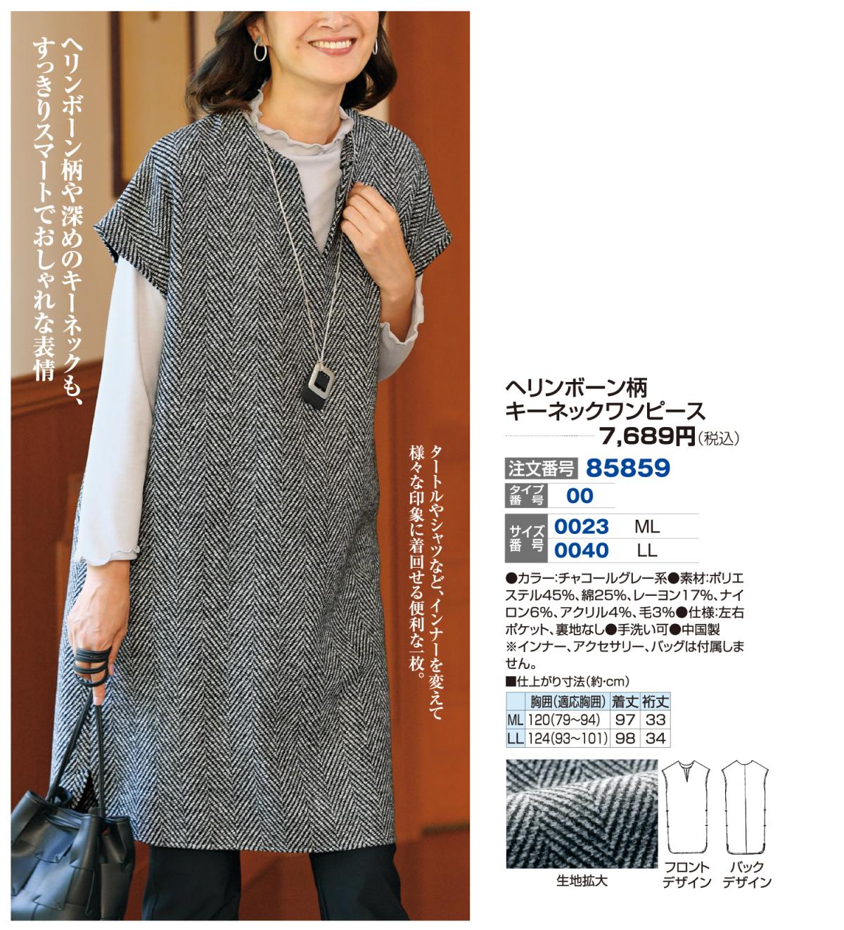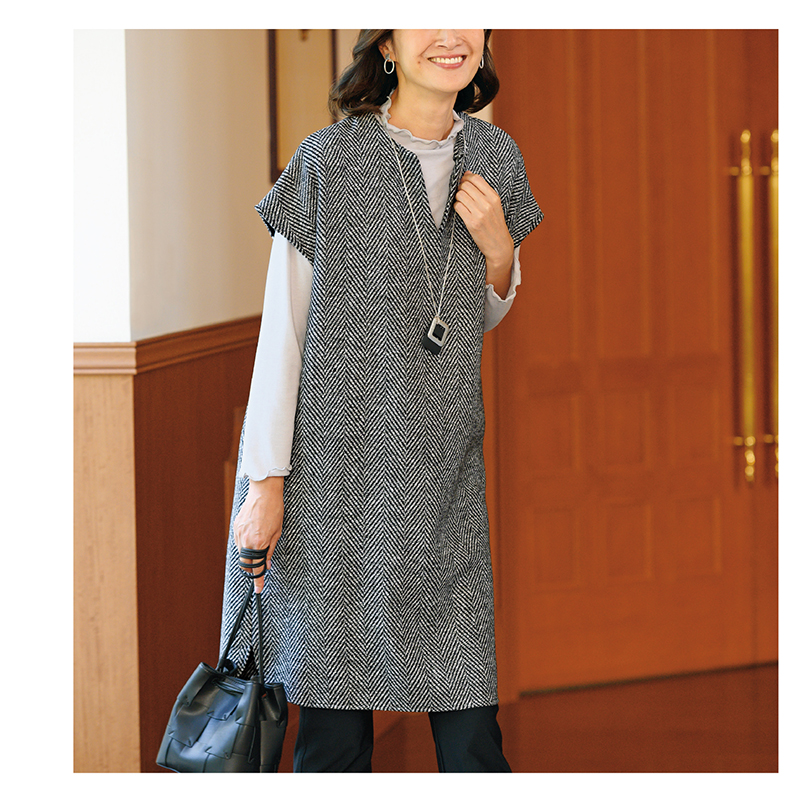 3. ヘリンボーン柄キーネックワンピース