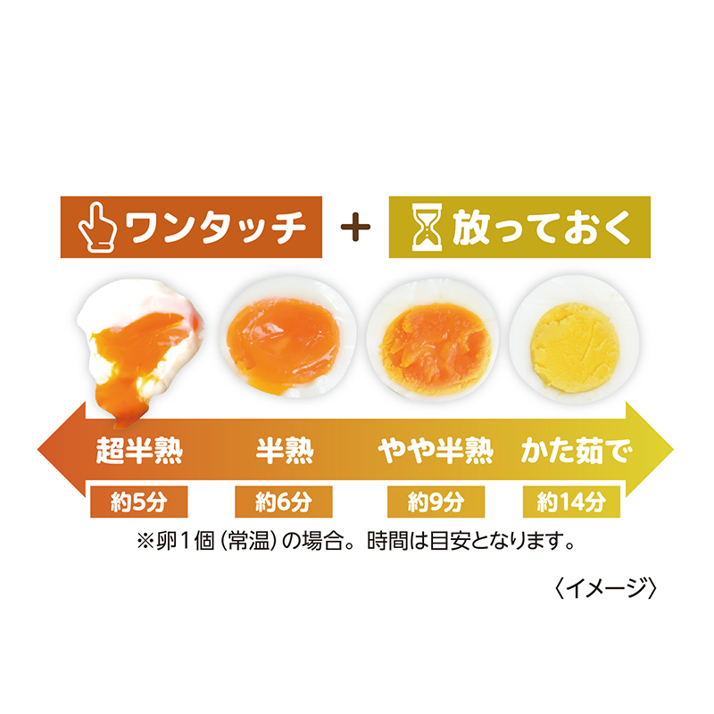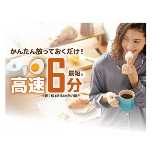 忙しい朝のもう一品にぴったり! 放っておけば、ゆでたまご完成! ゆでたまごって面倒! 高速エッグスチーマーなら水と卵を入れ、スイッチを押して放っておくだけ! ブザーが鳴ったら完成! 最大3個まで調理可能。水量と時間を調整すれば、超半熟からかたゆでまで思いのまま。 ●サイズ(外寸・約):幅19.5×奥行8.4×高さ13.6cm/電源ケーブル長さ=1.2m ●重量(約):400g ●材質: ポリプロピレン、ポリカーボネート、スチール、他 ●電源:AC100V ●定格消費電力:210W ●安全装置:サーモスタット約115度、温度ヒューズ157度 ●計量カップ付 ●中国製 ※ご使用後の返品・交換はお受けできません。