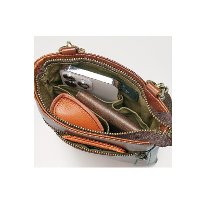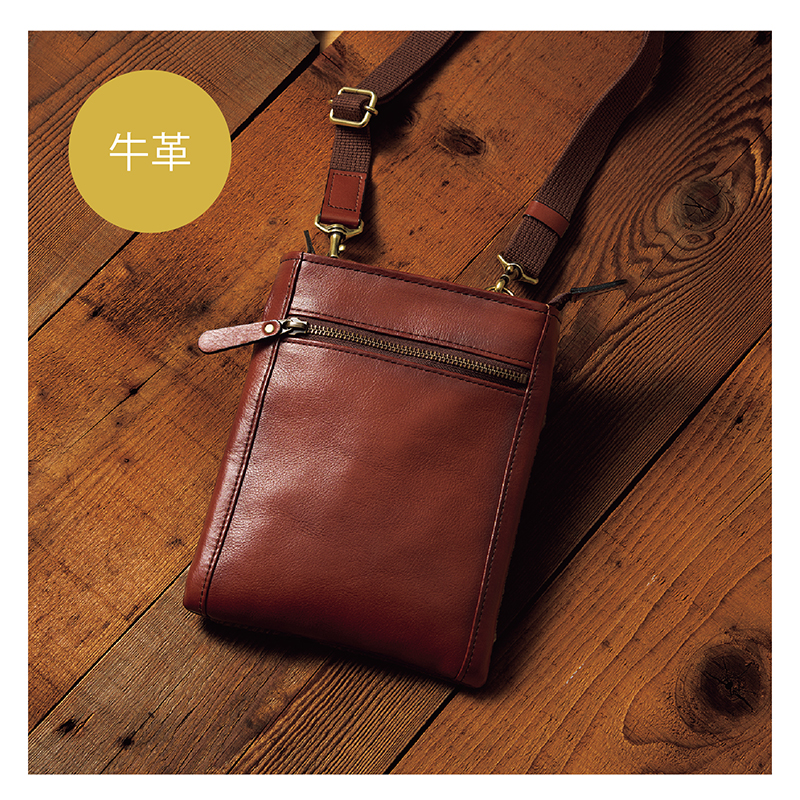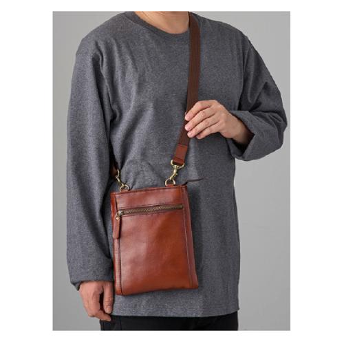 身軽に持てる薄マチ。味のある牛革も魅力。 鞄の街・兵庫県豊岡市で生まれた、匠の技が光る逸品。前ファスナーポケットも便利に使え、お出かけや旅行など身軽にお出かけする時に便利なバッグです。 ●カラー:ブラウン ●サイズ(外寸・約):幅18×高さ23×厚さ3cm/ショルダーベルト長さ=76~134cm(着脱可) ●重量(約):300g ●材質:表地=牛革/裏地=綿/ショルダーベルト=アクリル ●仕様:ファスナーメインコンパートメント(内部にオープンポケット×3)/前面=ファスナーポケット×1/背面=マグホック留めオープンポケット×1 ●日本製 ※商品の性格上、一点一点風合い等が異なります。