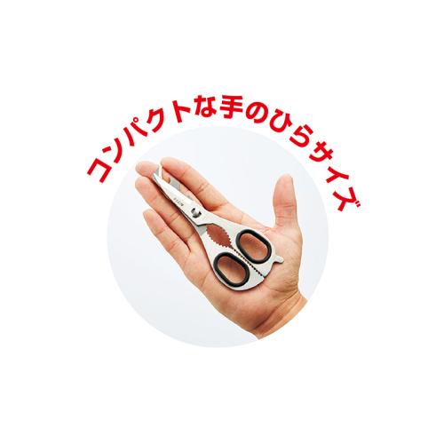 8つの機能を備えた多機能ハサミ! これがあれば安心です。 災害時、キャンプはもちろん、台所で道具がなくて困った時も、これがあれば大丈夫。ハサミはもちろん、栓抜き、缶切り、ナイフなど、8つの機能で役立ちます。 ●サイズ(約):幅5.4×長さ13cm ●重量(約):55g ●材質:本体=ステンレス420J2/ケース=牛革 ●仕様:ハサミ、マイナスドライバー、栓抜き、缶切り、ガス抜き、キャップ開け、殻割、ナイフ(分割して使用) ●付属品:カラビナ付革ケース ●日本製 ※ご使用後の返品・交換はお受けできません。