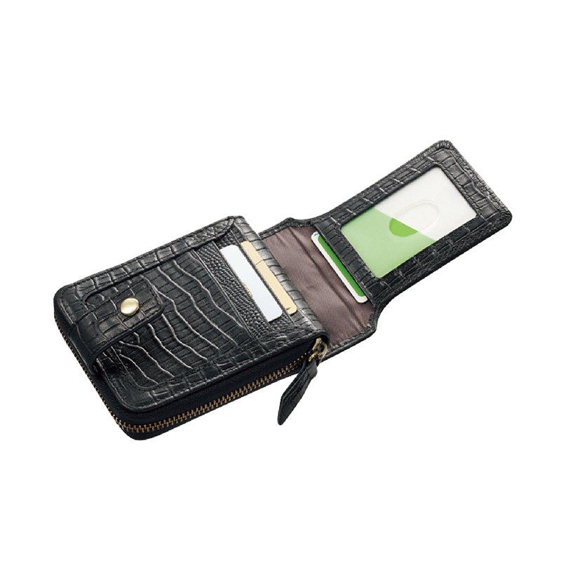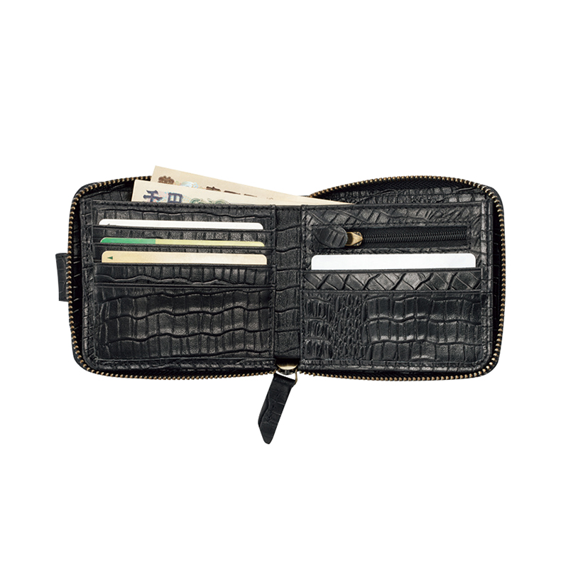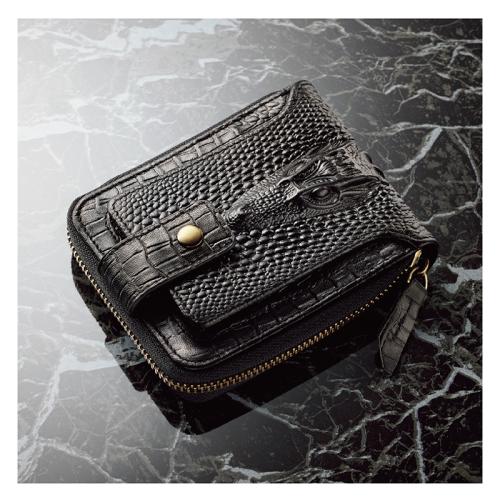 クロコ型押しの艶やかさと使いやすさが魅力の牛革財布。 男らしさを引き立てるクロコ型押しのデザイン。手のひらサイズのコンパクト設計ながらも、カード入れや札入れなど収納が充実。日常使いに重宝する本革仕様の財布です。●カラー:ブラック ●サイズ(外寸・約):幅12×高さ10×厚さ3cm ●重量(約):140g ●材質:表地=牛革/裏地=ポリエステル ●仕様:ラウンド式ファスナー開閉、札入れ×2、カード入れ×6、ファスナー式小銭入れ×1、オープンポケット×2/前面=フラップボタン留めパスケース、カード入れ×3、オープンポケット×1 ●中国製 ※商品の性格上、一点一点風合い等が異なります。