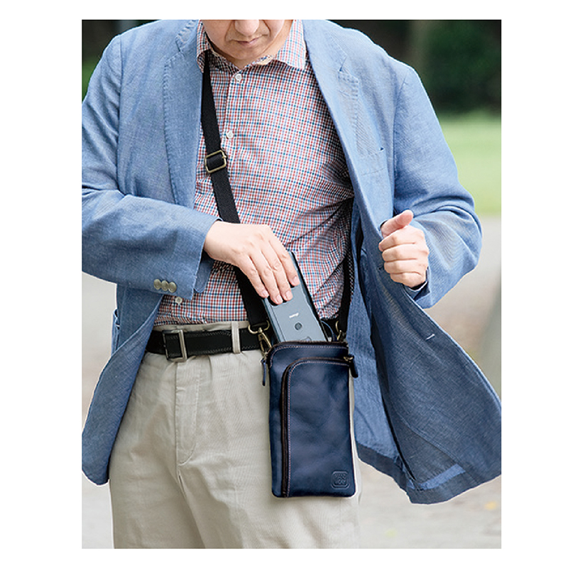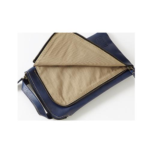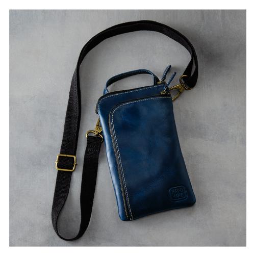 スマホもスッと入る前面ポケット搭載。使いやすいコンパクトサイズポーチ。 味わいのあるオイルレザーを贅沢に使用した、使い勝手の良いコンパクトサイズの牛革製ポーチ。革の断面を全てコバ塗りした丁寧な作り。ショルダーを外せばハンドル付のポーチとしてバッグの中に入れても使えます。 ●カラー:ネイビー ●サイズ(外寸・約):幅13×高さ22×厚さ2cm/ショルダーベルト長さ=80~145cm(着脱可)/持ち手高さ=4cm ●重量(約):250g ●材質:表地=牛革(オイルレザー)/裏地・ショルダーベルト=綿 ●仕様:ファスナーメインコンパートメント(内部にキーリング×1、仕切り×1)/前面=ファスナーポケット×1/背面=オープンポケット×1 ●バングラデシュ製
