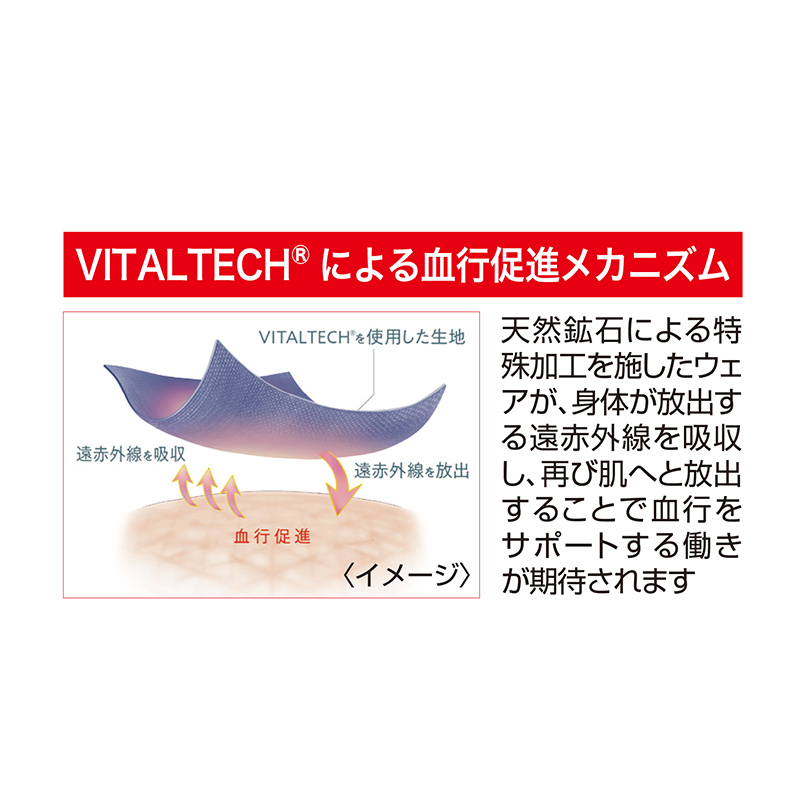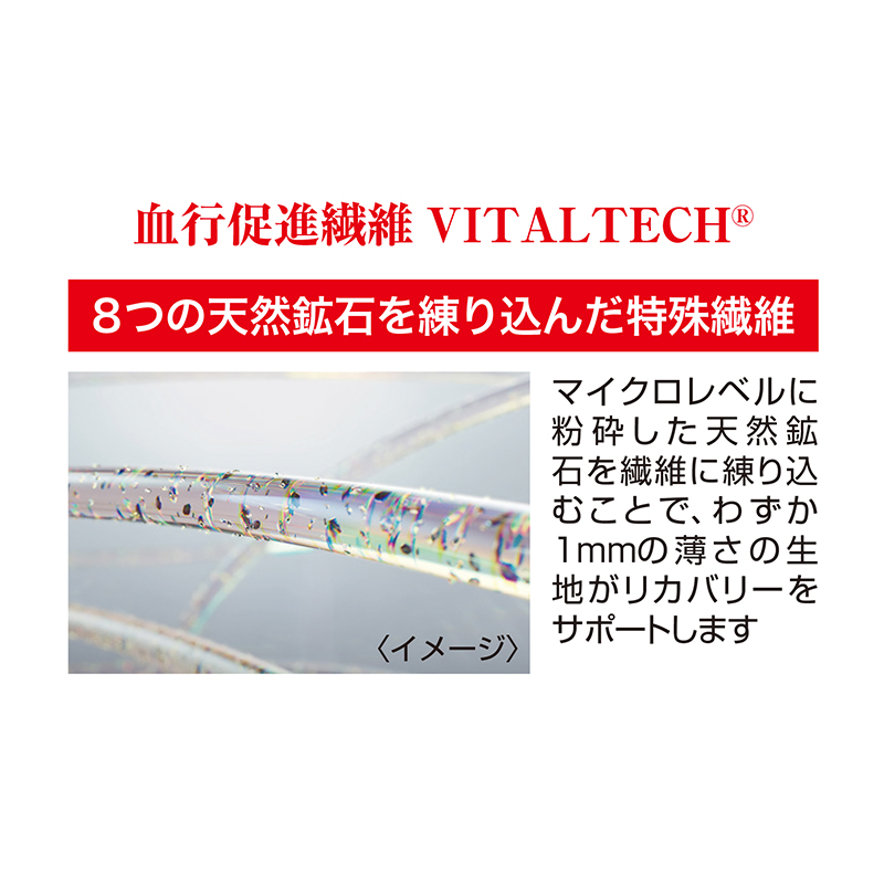 着るだけで、血行促進、疲労回復。リカバリーウェア。 血行促進繊維VITALTECH(バイタルテック)を採用。遠赤外線の効果により、血行促進・疲労回復など5つの効果効能が期待できます。●素材:ポリエステル70%、レーヨン21%、ポリウレタン9% ●販売名:ReDリカバリーウェア(天竺) ●一般名称:家庭用遠赤外線血行促進用衣 ●医療機器製造届出番号:23B2X10055RD0101 ●洗濯機可 ●カンボジア製〈製造販売事業者:株式会社MTG〉 ※衛生商品のため、開封後の返品・交換はお受けできません。