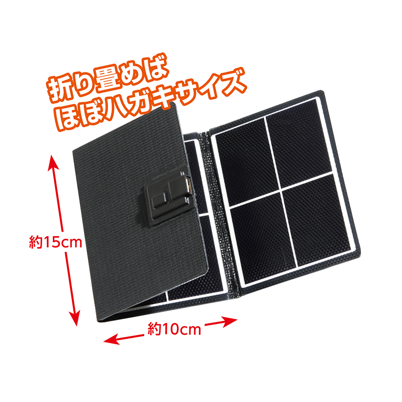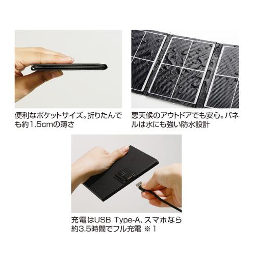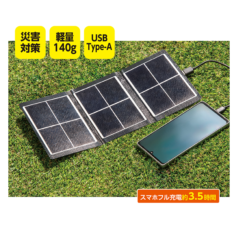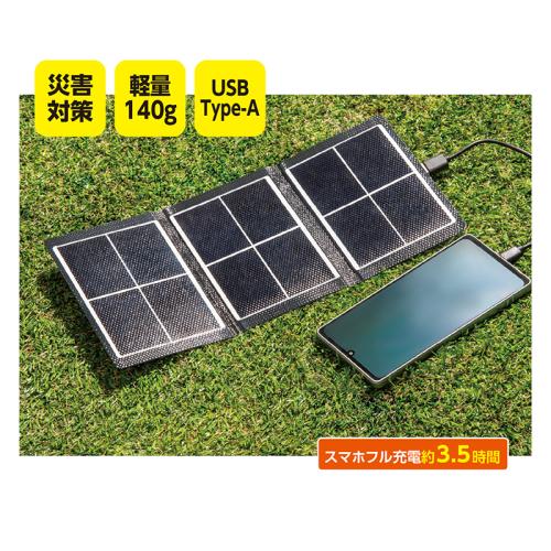 小さい・軽い・薄い!! 備えて安心、充電パネル。 もしもの時にも頼りになる、ポケットに収まるコンパクトサイズのソーラー充電器。太陽光でスマートフォンやタブレット、モバイルバッテリーをすぐに充電できます。 ●サイズ(約):幅10×高さ15×厚さ1.5cm(折りたたみ時) ●重量(約):160g ●仕様:ソーラーパネル最大出力=7W/変換効率=23%/最大電圧=6V/最大電流=1A/出力端子=USB(Type-A) ●中国製 ※蓄電はできません。 ※充電コードは付属しておりません。 ※1:3227mAhスマートフォンの目安。(日照条件等により異なります) ※ご使用後の返品・交換はお受けできません。