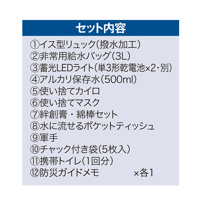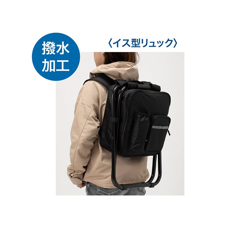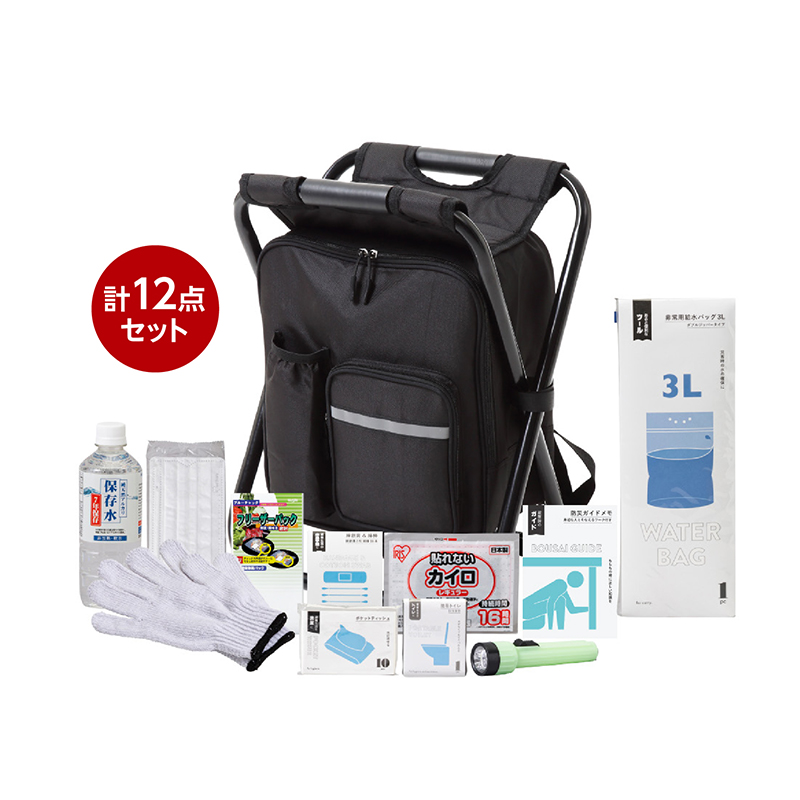 もしもの備えをまとめて持ち運ぶ、座って休める防災リュック。 リュック兼イスとして使える多機能防災リュック。必要な防災用品をまとめて収納でき、撥水加工で雨や水濡れにも安心です。 ●カラー:リュック=ブラック ●サイズ(外寸・約):リュック部=幅32×奥行15×高さ29cm/イス使用時=幅30×奥行28×高さ43cm/折りたたみ時=幅30×奥行8×高さ50cm ●重量(約):2.4kg ●耐荷重(約):120kg ●材質:ポリエステル、鉄、ポリエチレン、ポリスチレン、他 ●仕様:ファスナーメインコンパートメント×1/前面=ファスナーポケット×1、ペットボトル用ポケット×1/背面=ショルダーベルトカバー ●中国製(セット内容は一部日本製、タイ製) ※ご使用後の返品・交換はお受けできません。