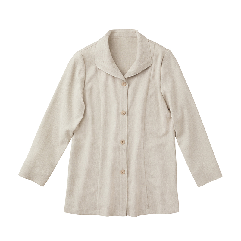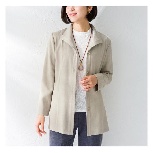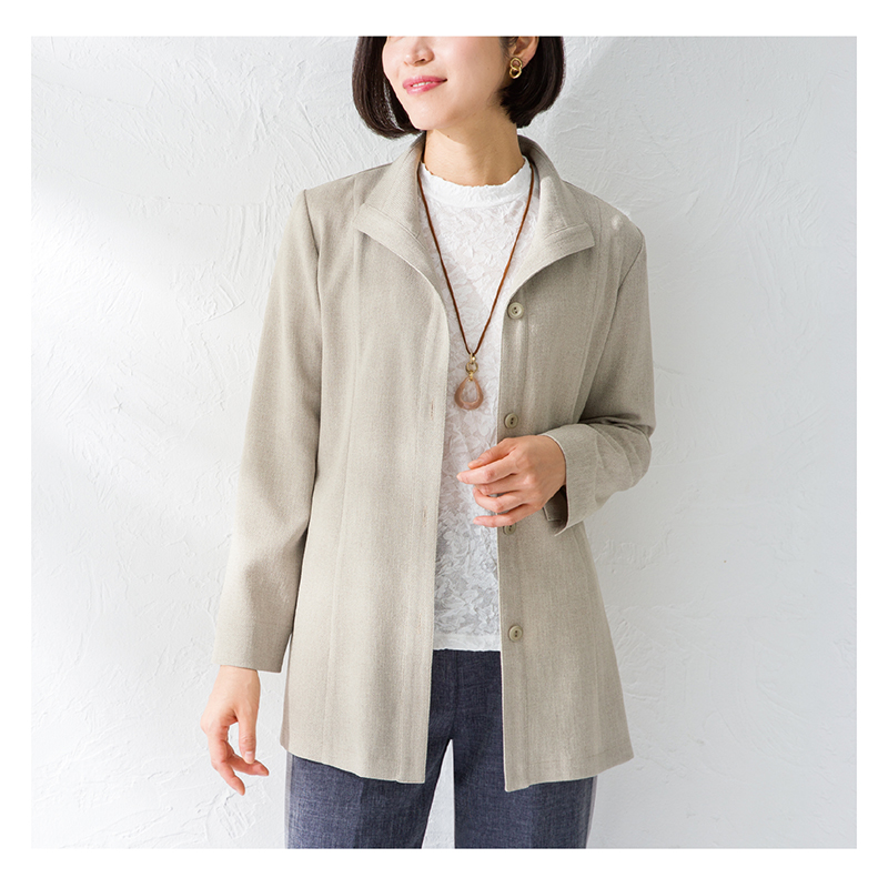 リネンのような風合いとウイングカラーで品良く軽やかな印象に。 サッと羽織れる着心地のよいジャケット。大きく開いたウイングカラーで顔まわりもすっきり。シワになりにくいので旅行にもおすすめです。●カラー:グレージュ系 ●素材:ポリエステル98%、ポリウレタン2% ●仕様:前ボタン全開(4個)、袖口スリット(約3.5cm)、両脇スリット(約4.5cm)、両脇ポケット ●手洗い可 ●日本製 ※インナー、アクセサリーは付属しません。